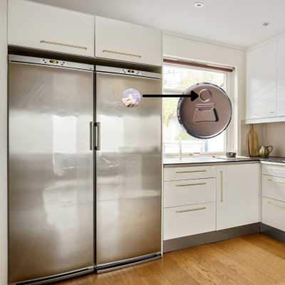 Miroir de poche d'une mère tenant son enfant, photographie prise sur la façade d'un bâtiment à Angers.