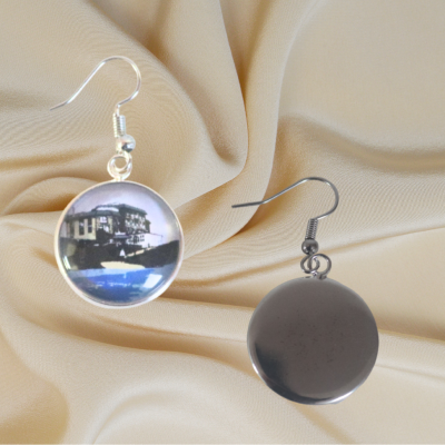 Boucles d'oreille illustrées de la cabane La Poulette à Agon-Coutainville sur la Côte des Isles en Normandie. Bague fabriquée artisanalement à partir d'une photographie prise par une créatrice bretonne.