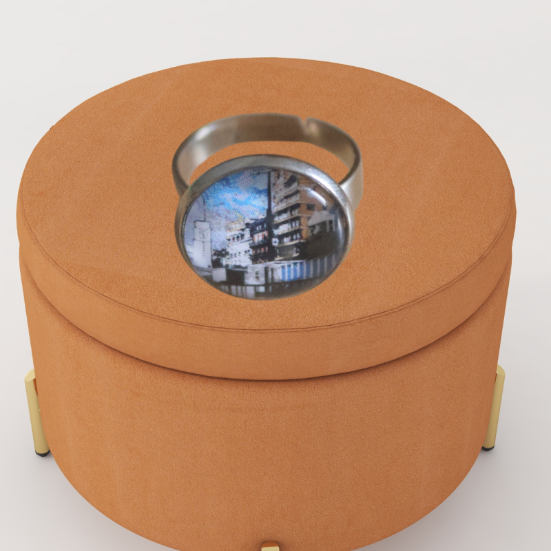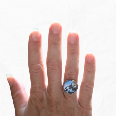 Mode de fabrication : Bijou fait main, réalisé à partir d’une photographie de la créatrice, digitalisée puis imprimée sur papier et intégrée au cabochon.