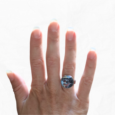 Bague en métal argenté composé d'un cabochon en verre de diamètre 20mm.