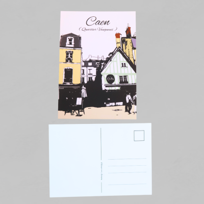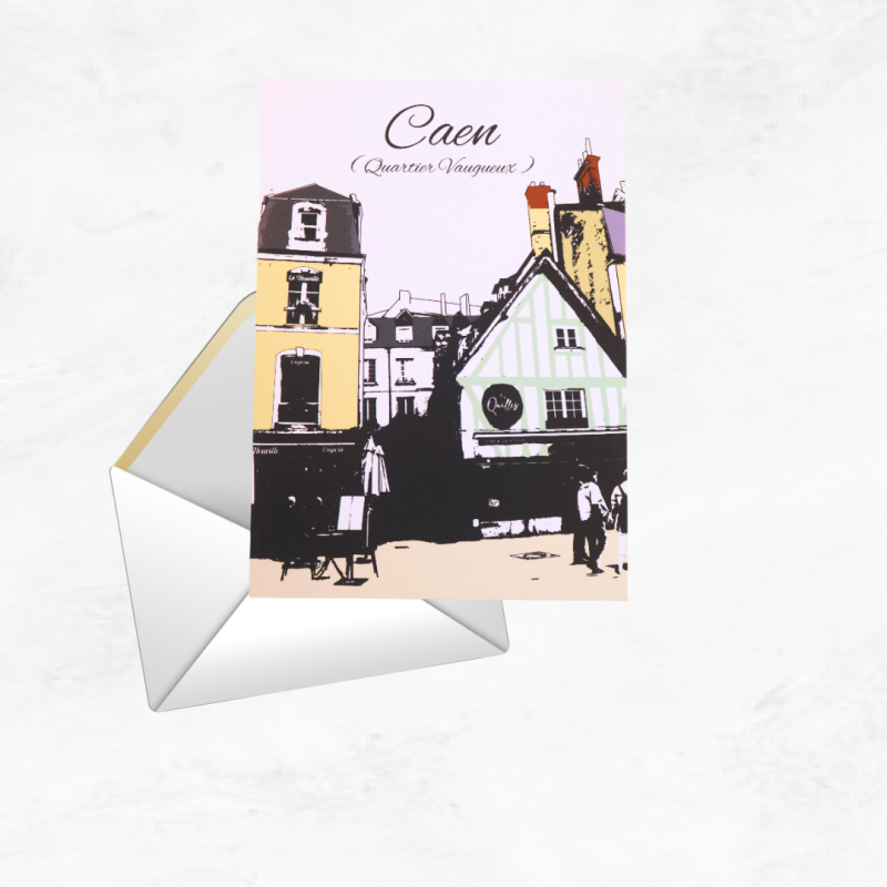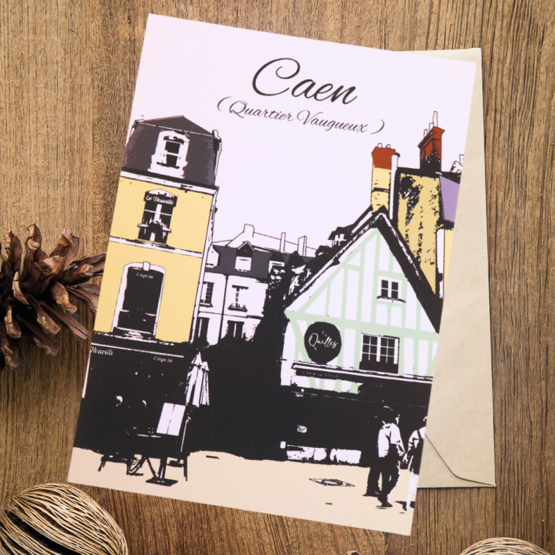 Cette carte capture l’âme du Vaugueux : ses colombages, ses petites rues animées, ses couleurs douces et ce charme vivant propre aux quartiers historiques. Un fragment d’histoire caennaise à conserver ou à offrir.