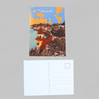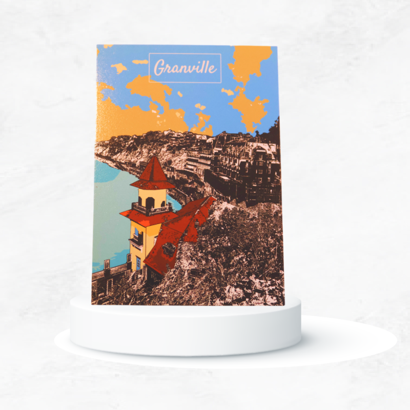 Cette carte saisit l’essence du Plat Gousset : son casino à l’allure méditerranéenne, ses falaises majestueuses, son ciel scintillant et sa mer calme. Une véritable parenthèse lumineuse, typique de Granville, à conserver ou à offrir.