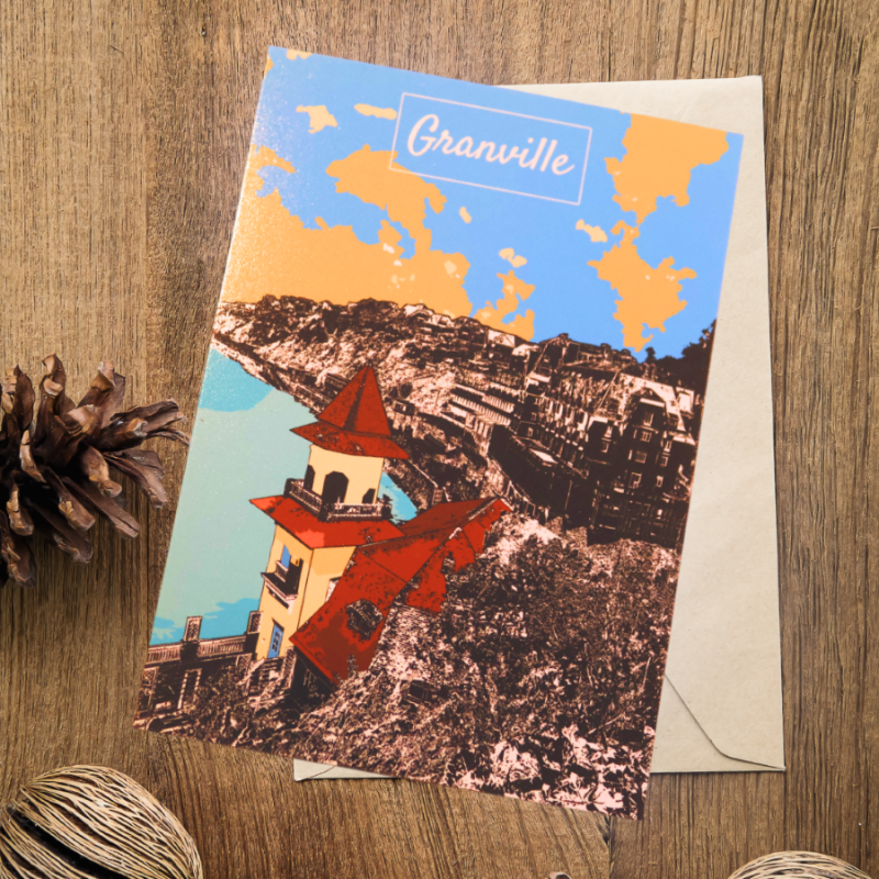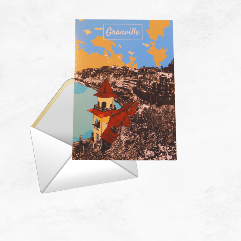 Au centre, la tourelle méditerranéenne du Casino, avec son toit en tuiles et ses murs jaune pâle et orangé, attire immédiatement le regard. La mer bleue et la végétation noire créent un contraste fort, donnant à l’illustration un caractère moderne et élégant. Cette carte dégage une sensation de vacances, de lumière et de douce nostalgie, fidèle à l’ambiance si particulière de la côte granvillaise.