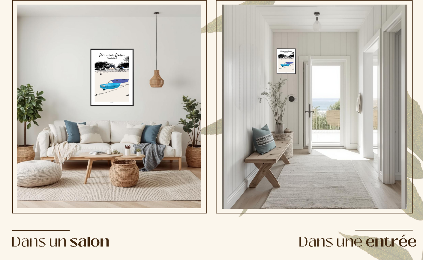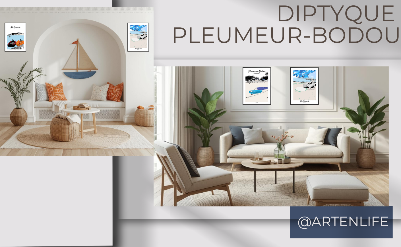 Créer un diptyque avec des affiches de Pleumeur-Bodou permet d’ancrer la décoration dans une ambiance à la fois contemporaine et profondément liée au paysage côtier. Dans un salon au style minimaliste, l’association de l’affiche de la plage de Landrellec, avec ses barques bleues et son atmosphère lumineuse, et de l’affiche de la Carrière de Brintech, marquée par son granit gris et son ciel bleu, crée une continuité visuelle naturelle. Les teintes bleutées font écho aux coussins du canapé, les gris minéraux s’harmonisent avec les nuances du mobilier, tandis que les touches de vert rappellent subtilement les plantes de la pièce. L’ensemble dégage une sensation de calme, d’équilibre et d’élégance inspirée du littoral.