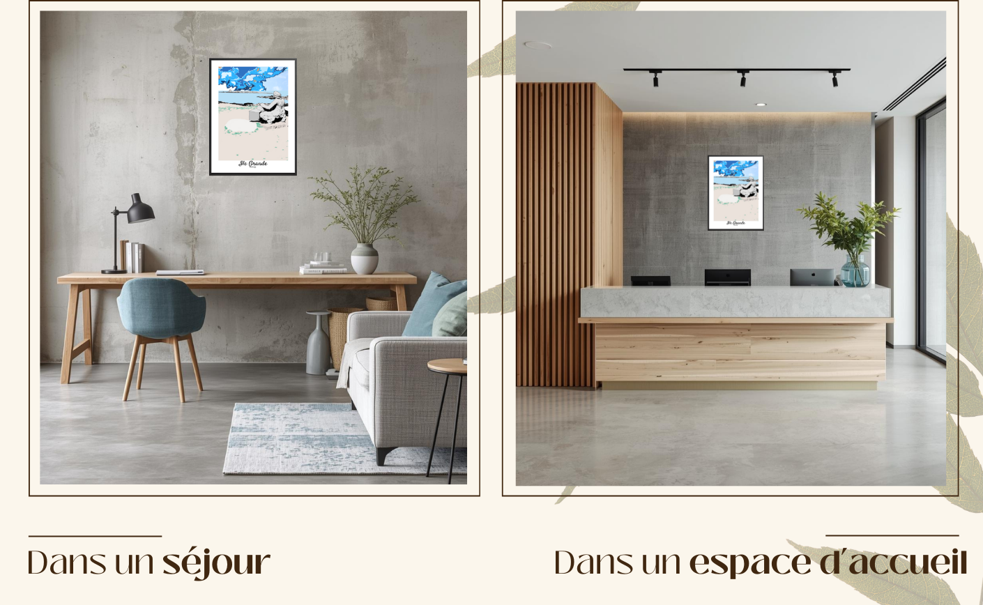 Côté déco, cette affiche s’intègre parfaitement dans un séjour intégrant un espace de travail ou un espace d'accueil d'un bureau. Elle convient à une décoration bord de mer contemporain, industriel doux ou minimaliste, avec bois brut, béton ciré, lin naturel, gris clair et vert sauge avec quelques teintes de bleu. Elle diffuse caractère, profondeur et inspiration.