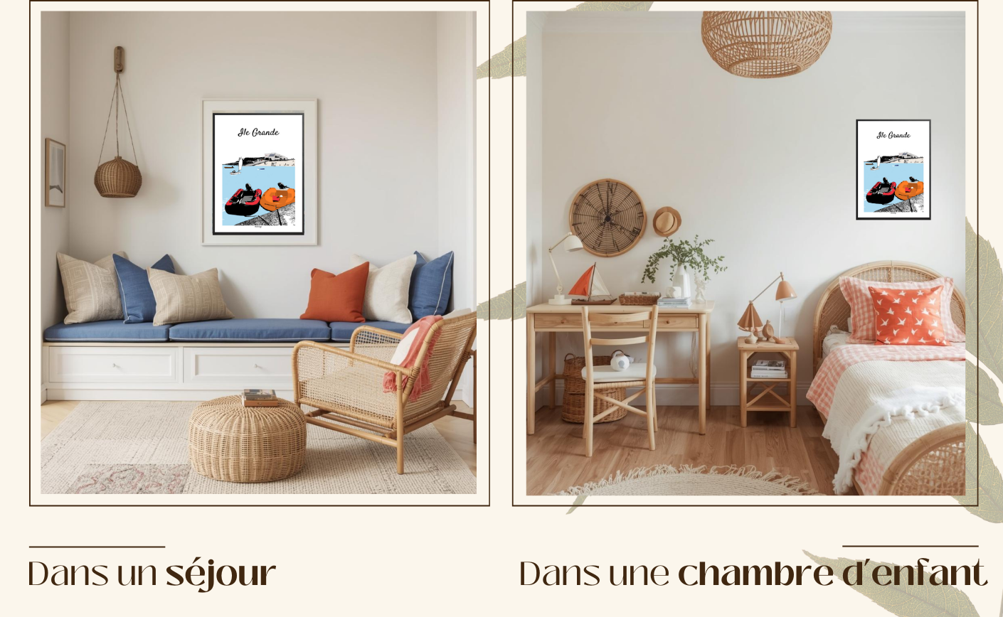 Côté déco, cette affiche est idéale pour un salon, un bureau ou une entrée. Elle s’accorde avec une décoration bord de mer, scandinave ou bohème, utilisant bois clair, lin, blanc cassé et touches de bleu océan et gris. Elle diffuse détente, authenticité et luminosité dans l’intérieur.