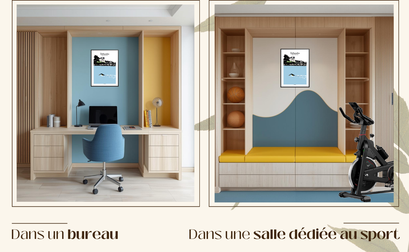 Cette affiche murale est idéale pour un bureau, une entrée ou un espace dédié au sport. Elle s’intègre dans une déco contemporaine ou minimaliste, associant bois clair, blanc cassé, bleu océan et touches de jaune. Elle insuffle énergie, inspiration et respiration visuelle.