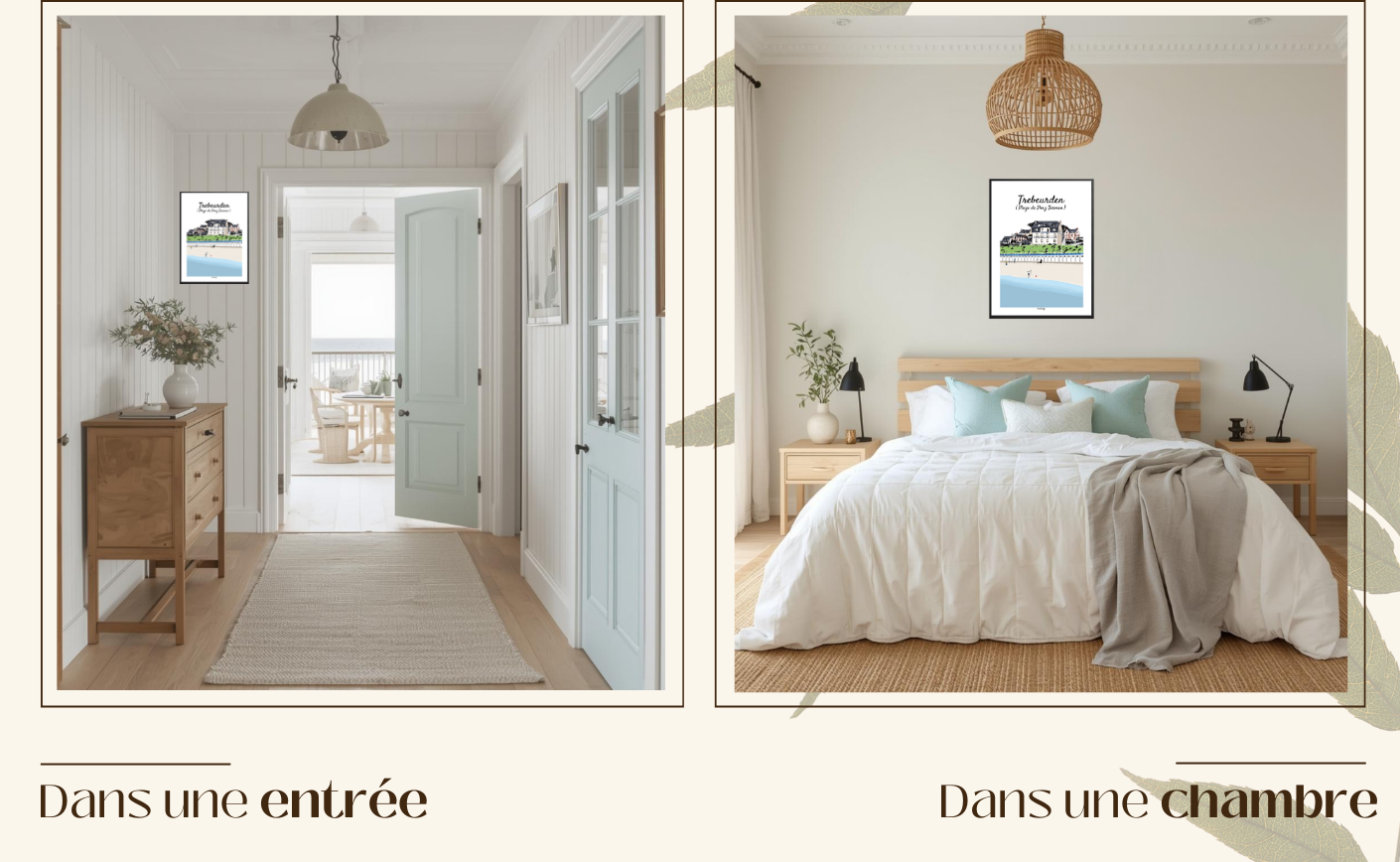 Chaque affiche devient un fragment de paysage, pensé pour s’intégrer dans une décoration murale d’intérieur : salon lumineux, chambre apaisante, entrée accueillante ou maison de vacances tournée vers la mer.