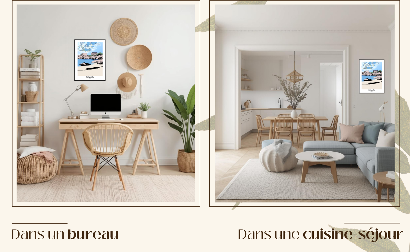 Cette affiche s’intègre naturellement dans un séjour-cuisine ou un bureau. Elle se marie avec une décoration bord de mer chic, scandinave ou bohème épuré, utilisant bois clair, lin, rotin, blanc cassé et touches de bleu pâle ou rose minéral. Elle diffuse douceur, lumière et sensation de vacances toute l’année.