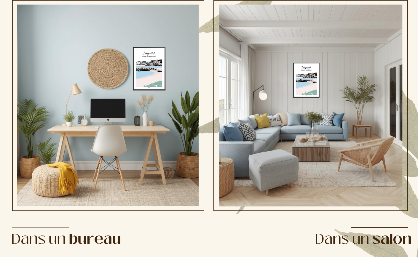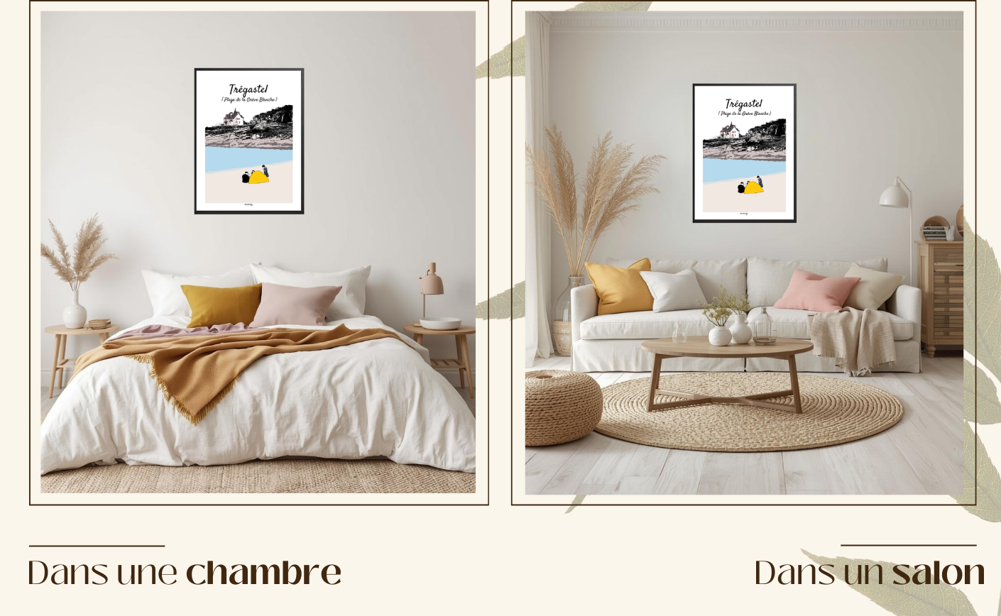 Dans un intérieur bohème contemporain, le diptyque devient un véritable fil conducteur décoratif. L’affiche de la plage de Ty-Lia, avec son sable doré, s’accorde naturellement aux coussins jaunes et aux pampas séchées, tandis que l’affiche de la Grève Blanche, marquée par ses rochers roses et sa touche de jaune, dialogue avec les coussins rosés du canapé. Ce contraste harmonieux entre les couleurs des affiches et les textiles renforce la cohérence de la pièce et apporte chaleur, douceur et caractère à l’espace. Une façon élégante d’intégrer l’esprit de Trégastel dans une décoration vivante et inspirée du littoral breton.