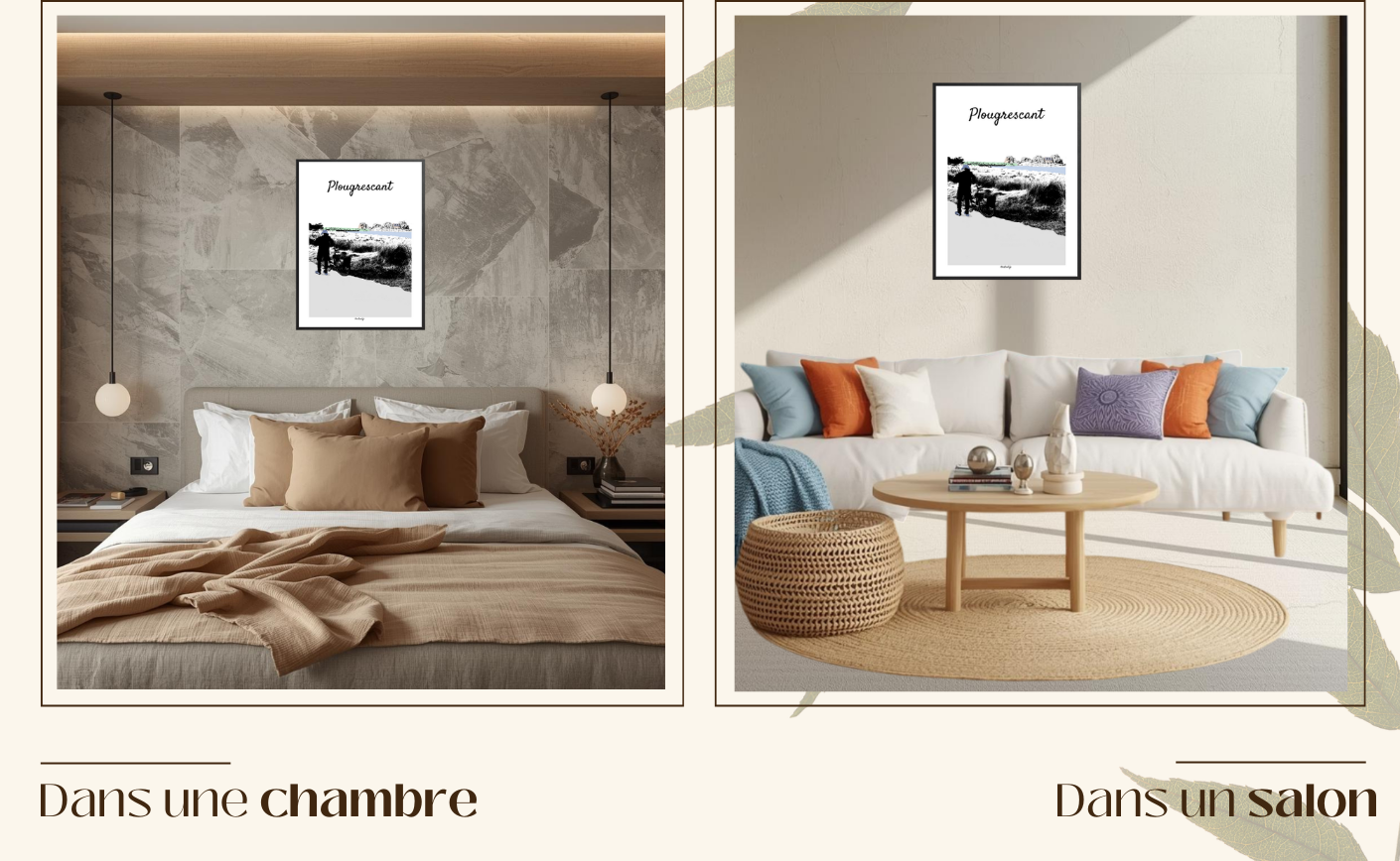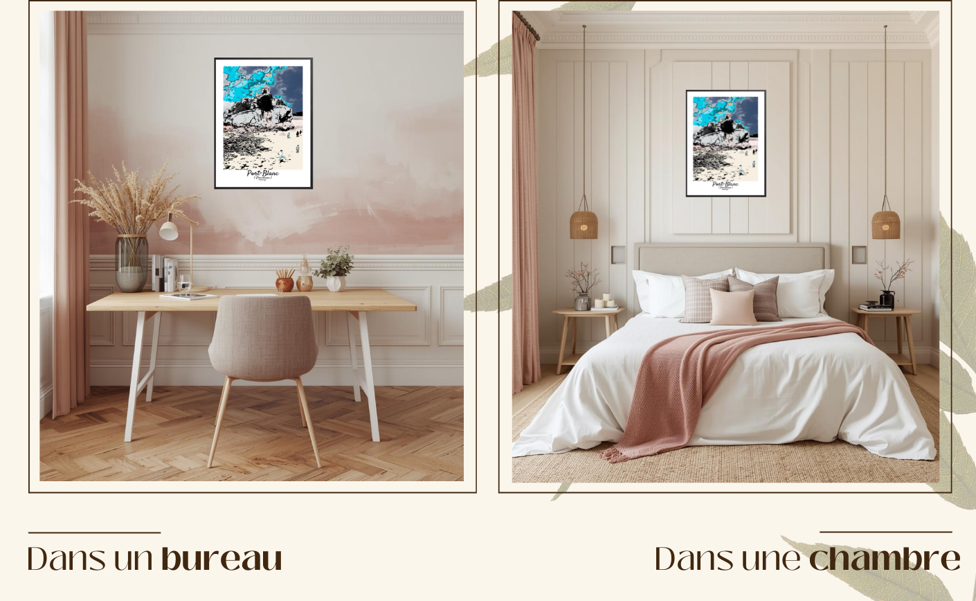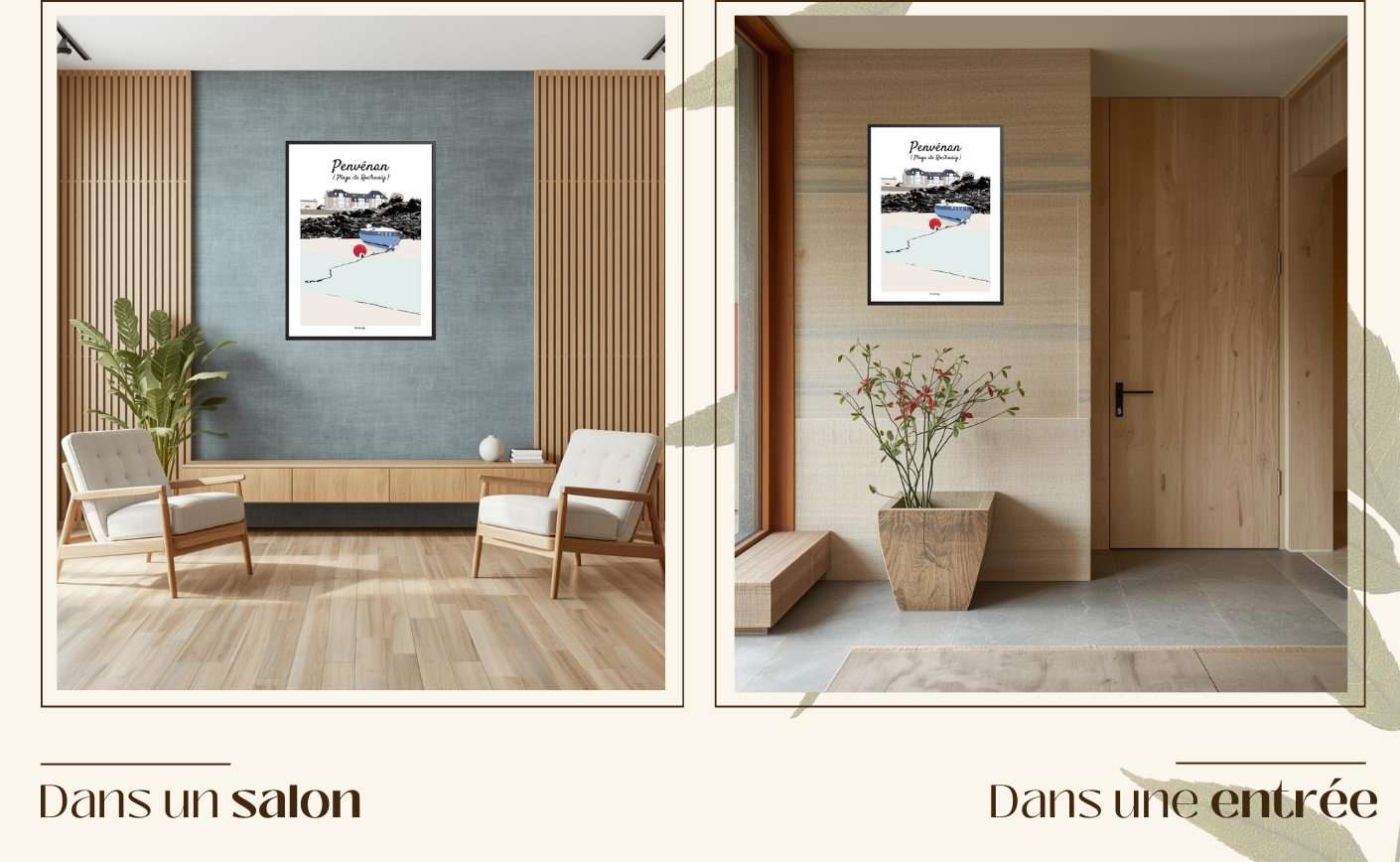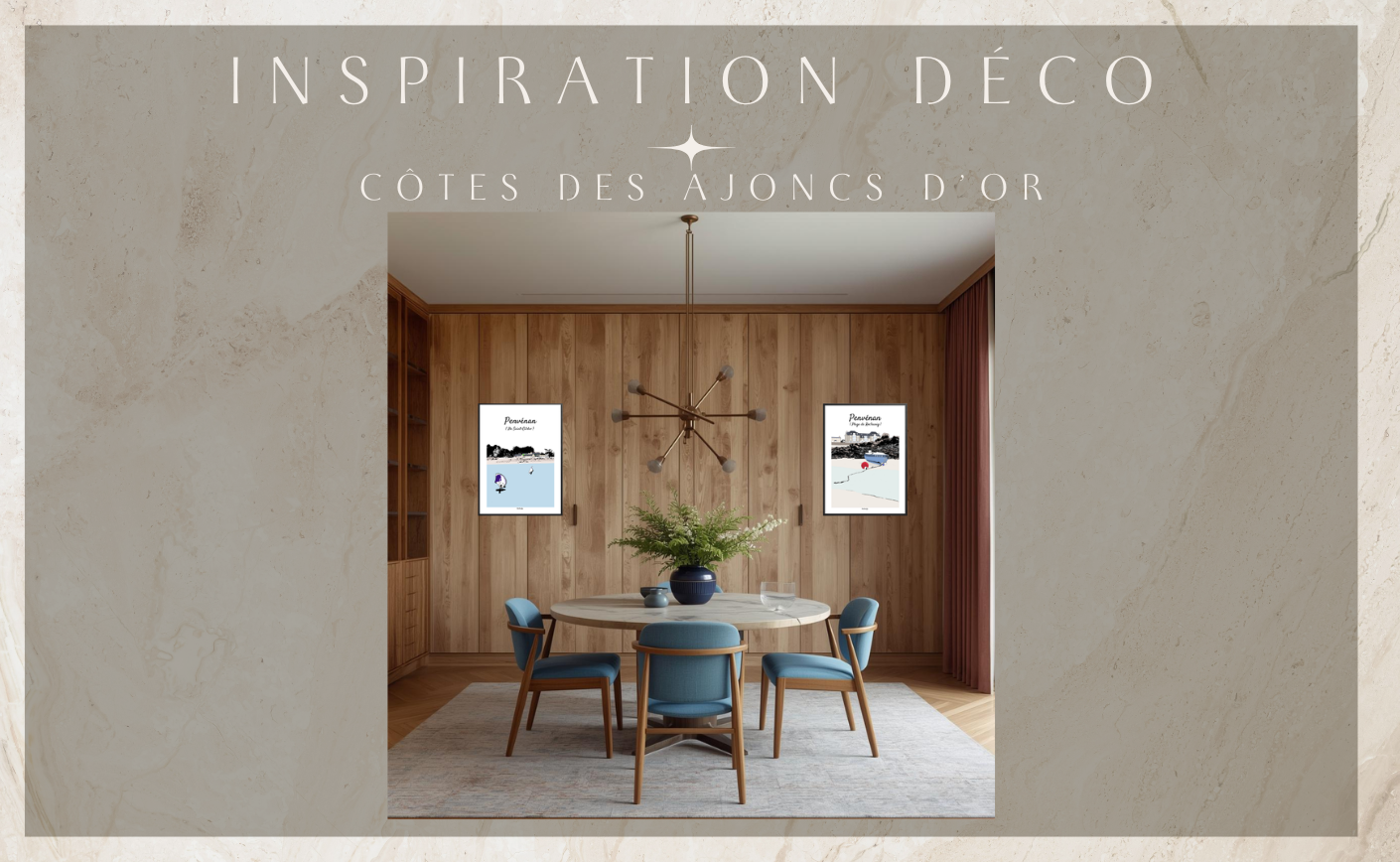 Dans cette salle à manger chaleureuse, le diptyque d’affiches associe la Plage de Rochanig à Penvénan et l’Ile Saint-Gildas, créant un dialogue entre mer et décoration intérieure. Les tons bleus de la mer et du bateau de Rochanig rappellent subtilement l’assise des chaises, tandis que les sables clairs et les touches de bois évoquent le mobilier et la table, renforçant l’harmonie visuelle.