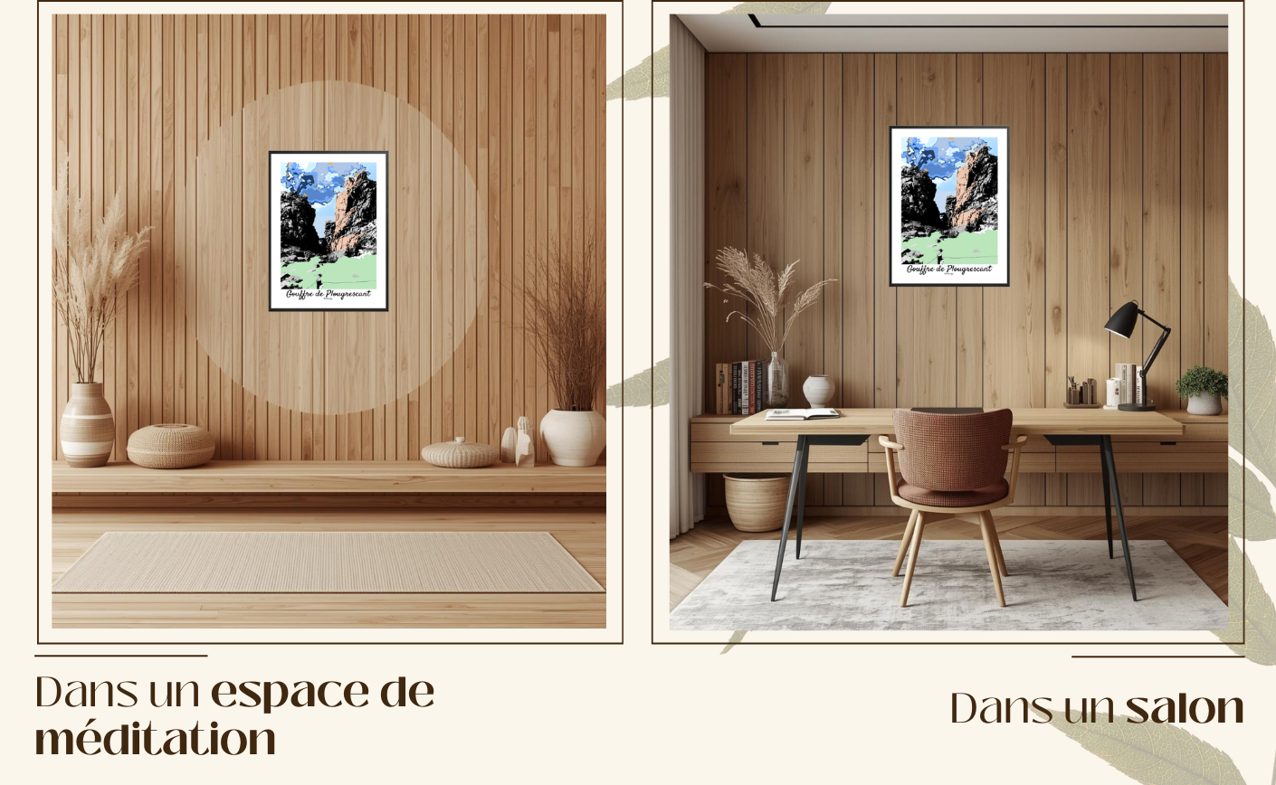 Dans un espace de méditation ou un bureau, elle s’associe à une déco minimaliste et nature brute, jouant sur le bois clair et les teintes minérales chaudes. Elle invite à l’évasion et à la contemplation.