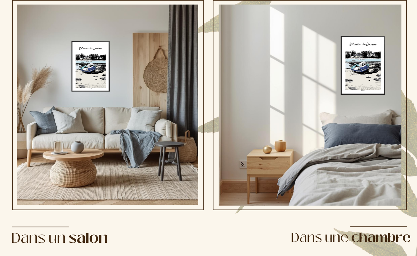Dans une salle d’attente ou un espace professionnel, les affiches de l’Estuaire du Douron et de la Plage des Curés apportent instantanément calme et réconfort. Installées sur un mur en bois clair, face à des fauteuils gris et à une table basse en rotin et verre, elles instaurent une atmosphère douce et rassurante. Les couleurs naturelles des affiches font le lien entre le mobilier contemporain et l’esprit chaleureux du bois, transformant l’attente en parenthèse apaisante.