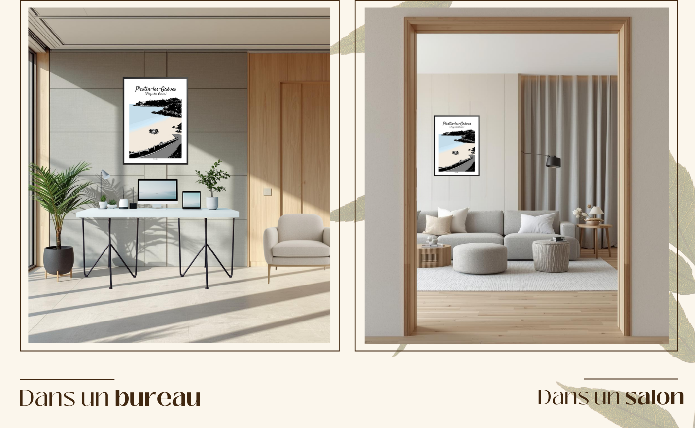 Enfin, dans un bureau contemporain, un diptyque associant Saint-Efflam et le Ruisseau de Kerdu permet de structurer un mur gris tout en apportant de la lumière. Les teintes marines et sableuses des affiches contrastent élégamment avec le mur minéral et s’accordent au bois clair présent dans la pièce, favorisant concentration, inspiration et sensation d’ouverture vers l’extérieur.