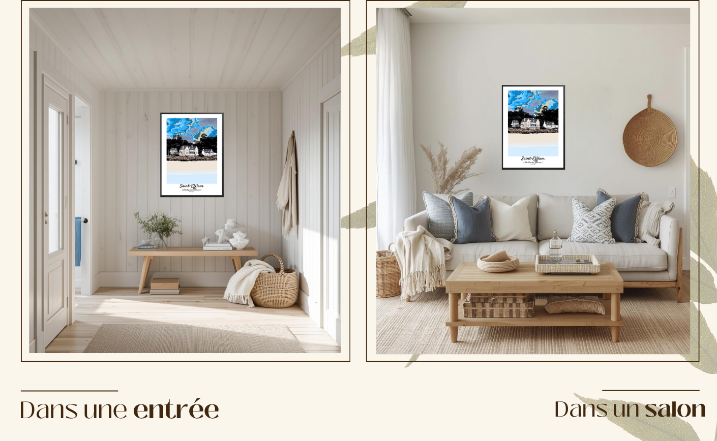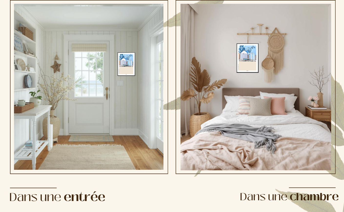En décoration, cette affiche trouve facilement sa place dans un salon ou une entrée. Elle s’accorde parfaitement avec une déco bord de mer, scandinave ou bohème, associée à du bois clair, du lin et des tons blanc cassé et bleu océan. L’effet recherché est une ambiance lumineuse et détendue, idéale pour créer une atmosphère douce et authentique.