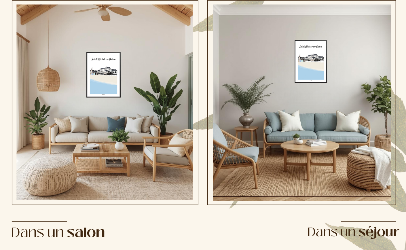 En déco, cette affiche est parfaite pour un salon ou une pièce à vivre d'une maison de vacances. Elle s’accorde avec un style classique chic, scandinave ou bohème élégant, en associant bois clair, rotin, lin et teintes bleu océan et vert doux. Elle apporte sérénité, luminosité et un véritable esprit vacances.