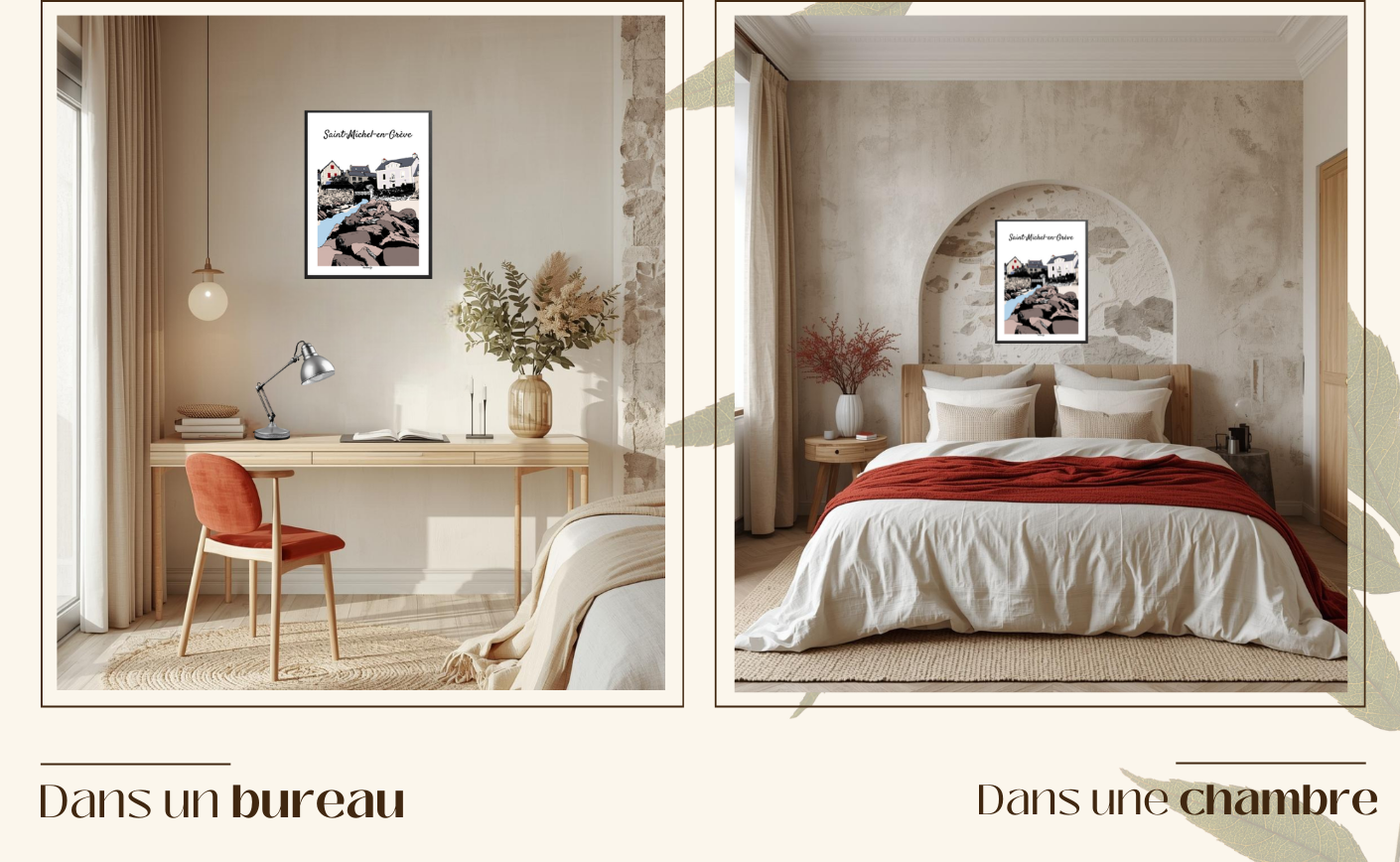 Pensées ensemble, ces compositions murales transforment les affiches de Plestin-les-Grèves et Saint-Michel-en-Grève en véritables éléments d’architecture intérieure, capables d’ancrer une décoration tout en faisant entrer la poésie du littoral breton dans chaque espace.