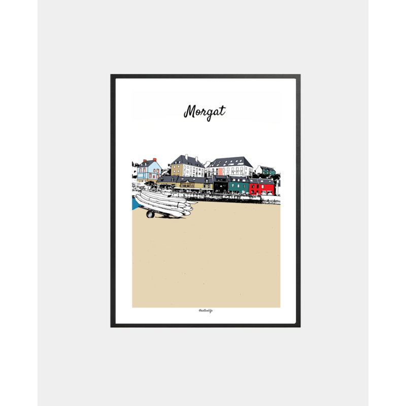 La grande plage de Morgat : entre kayaks posés sur le sable et maisons colorées, cette illustration graphique fait immédiatement remonter l’odeur de la crème solaire et le bruit des pagaies.