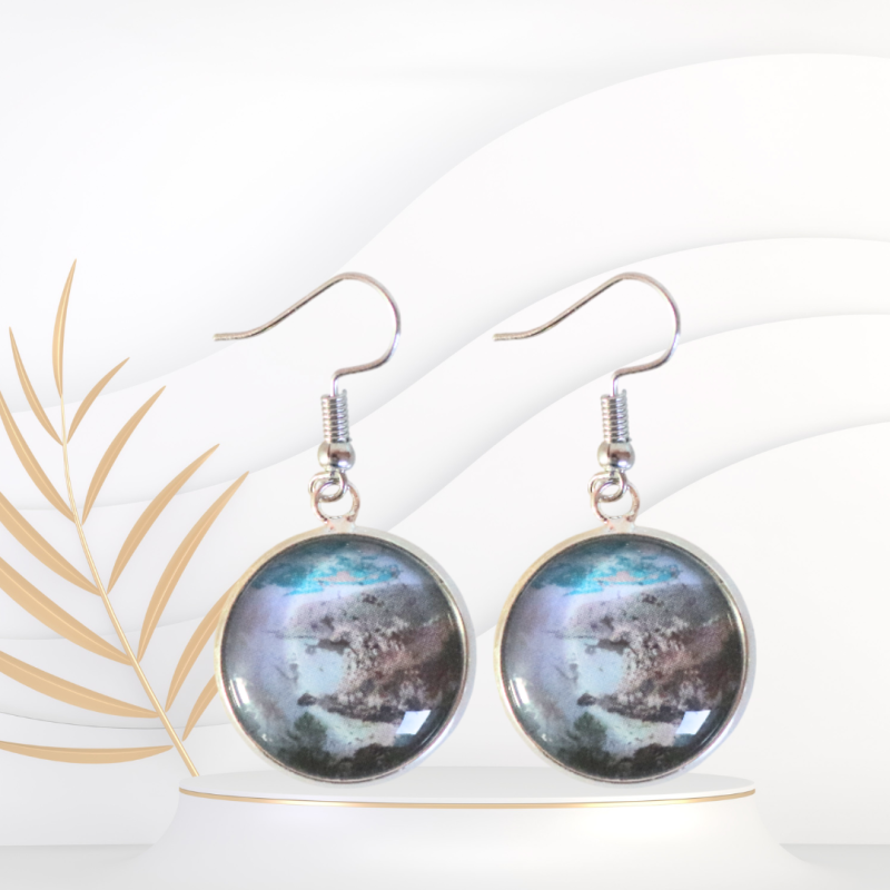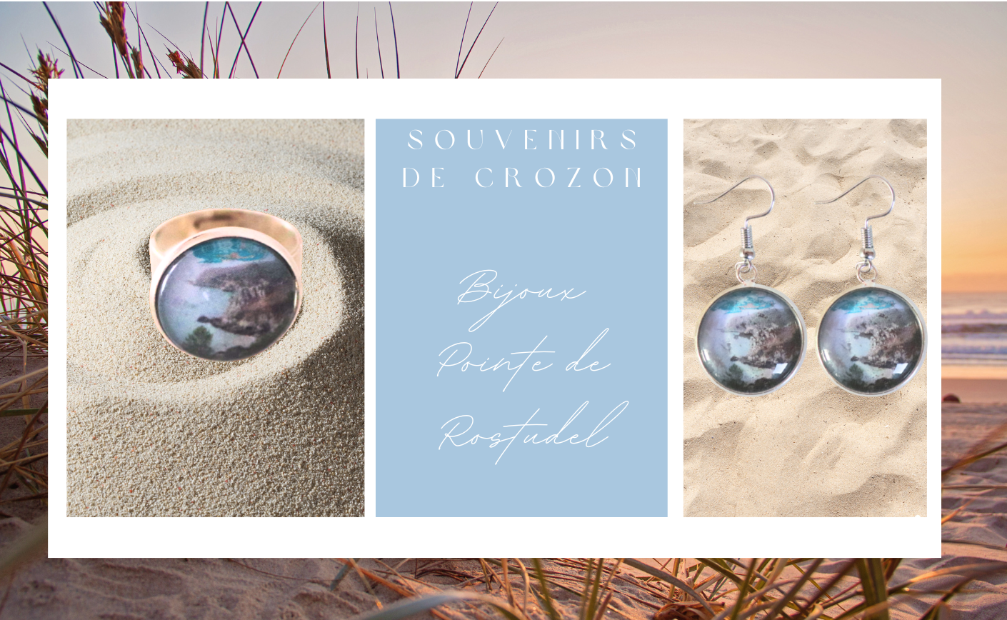 Inspirés de la pointe du Rostudel, ils restituent la palette printanière de la côte : eau turquoise, rochers végétalisés, ciel terracotta… Le cabochon en verre grossit l’image, comme pour mieux la graver dans la mémoire.
