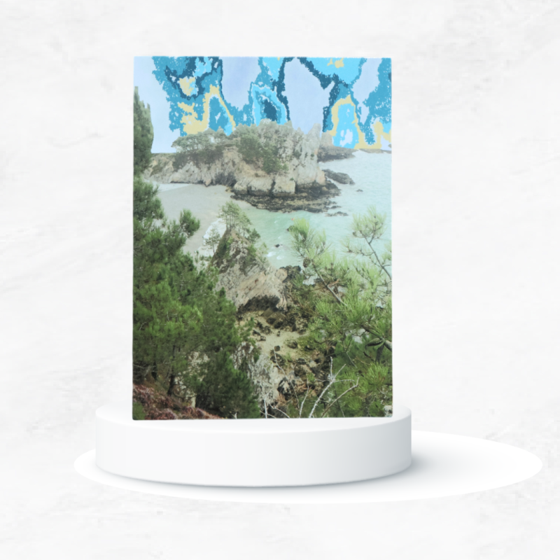 Illustrée en photographie artistique, elle montre les pins, les rochers, les eaux translucides… et deux kayakistes qui se fondent dans le paysage. Un petit bijou visuel, parfait à glisser dans une enveloppe, ou à encadrer pour ceux qui veulent garder ce coin de paradis à portée de vue.