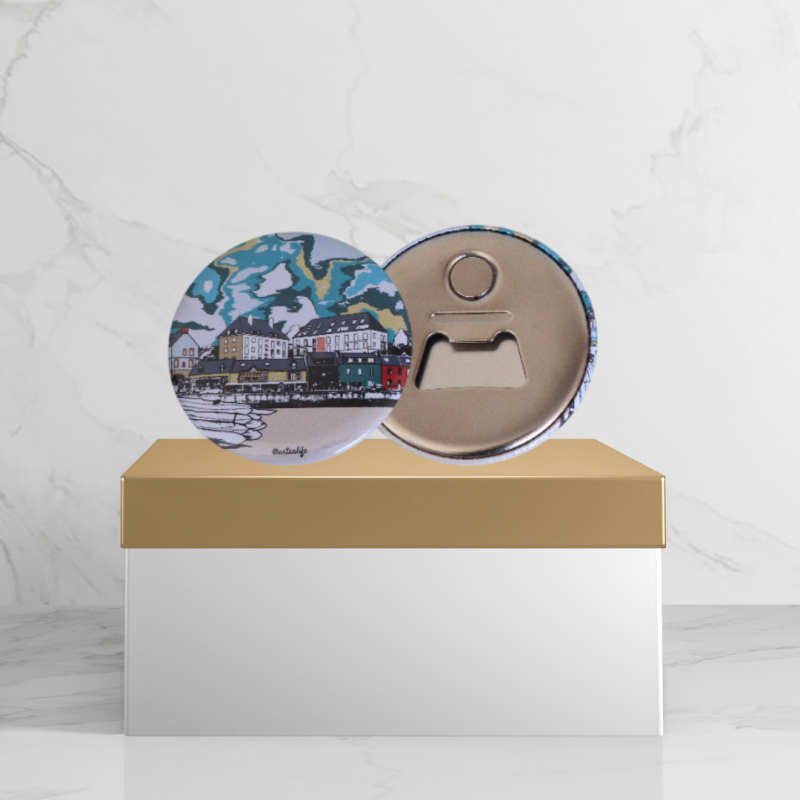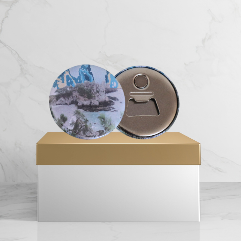 Le magnet-décapsuleur, c’est l’objet à avoir sur son frigo (et sur sa glacière) : il ouvre les bouteilles avec panache et affiche fièrement le port de Morgat, la plage du Kador ou la crique de l’île Vierge, dans un style graphique ou photographique artistique.