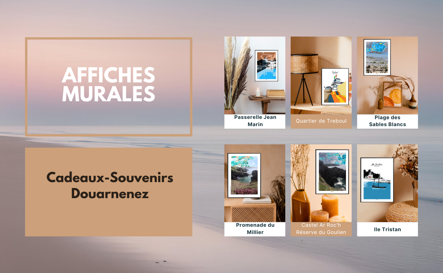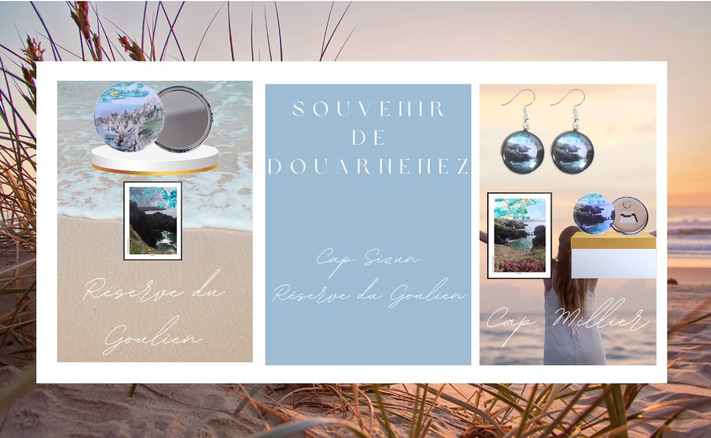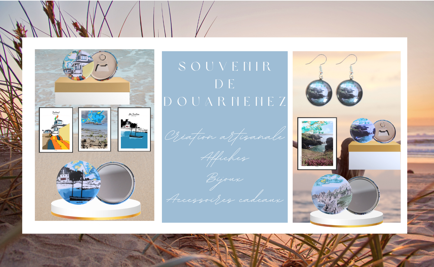 Découvrez des affiches illustrées, bijoux poétiques, magnets décapsuleurs et miroirs de poche, tous empreints de l’émotion unique d’un séjour à Douarnenez et de ses alentours. Chaque pièce est une création originale, bretonne, colorée et contemporaine, disponible exclusivement en ligne.