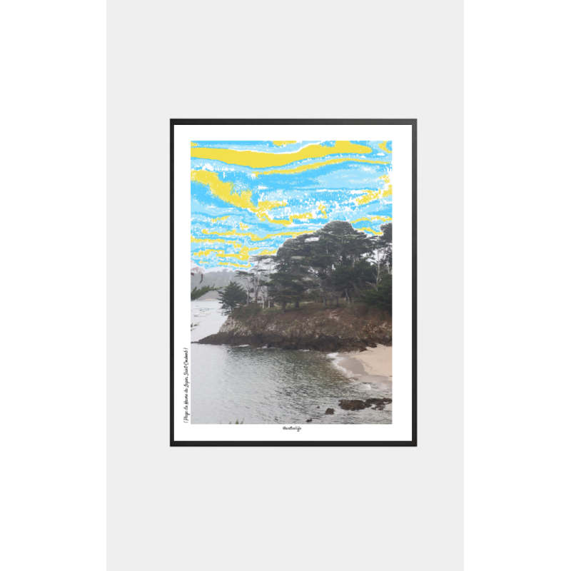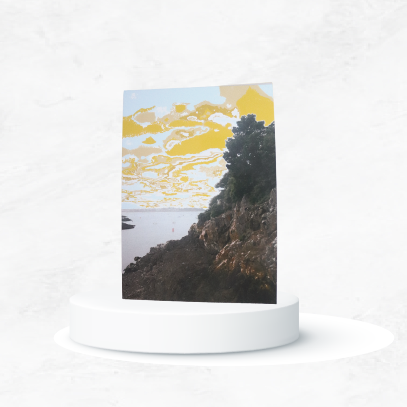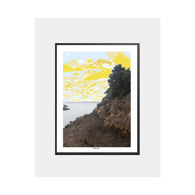C’est une fin d’après-midi au bord de la Rance, ce moment suspendu où la lumière caresse les falaises dorées. Le ciel, travaillé numériquement, explose en teintes jaunes, bleues et dorées, comme une aquarelle moderne. On entend presque le bruit feutré des pas sur le sable humide. Une photo artistique à l’allure rétro, mais au ciel résolument contemporain, pour ceux qui aiment leurs souvenirs avec un soupçon de poésie.