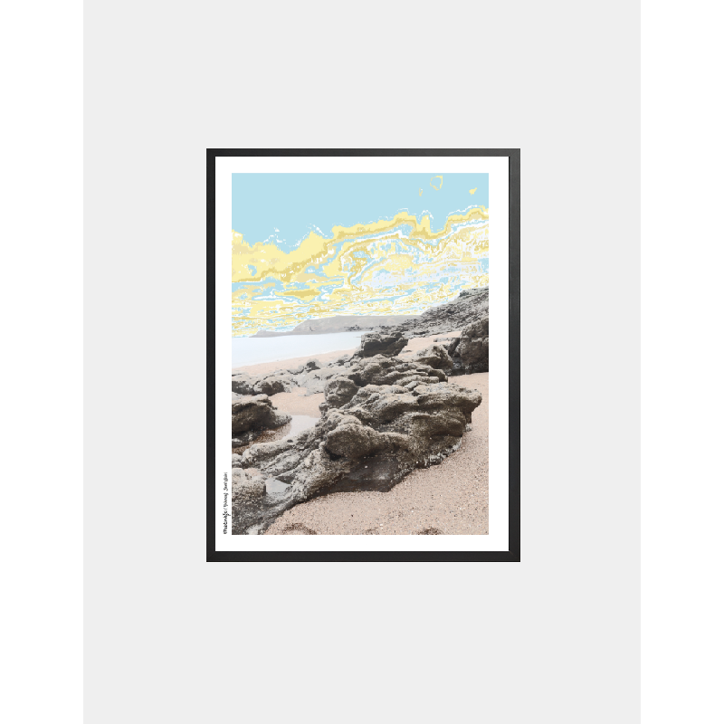 Vue imprenable sur la mer de la Manche, le sable fin, et les célèbres rochers, comme posés là par une main géante. Le regard file jusqu’à la pointe du Meinga, pendant que le ciel, dans une palette pâle de bleu, jaune et doré, rappelle les matins calmes et dorés. Une œuvre tout en subtilité, entre photographie et contemplation.