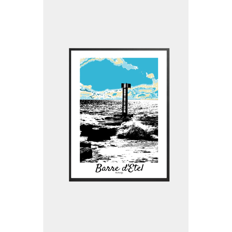 Côté illustration, c’est un souvenir visuel fort : la Barre d’Etel y est représentée dans une photographie artistique retravaillée numériquement. On y distingue l’épi emblématique émergeant des vagues en mouvement, avec un horizon profond et un ciel bleu océan stylisé, presque onirique. Une atmosphère brute et poétique, fidèle à ce lieu où la mer prend la parole.