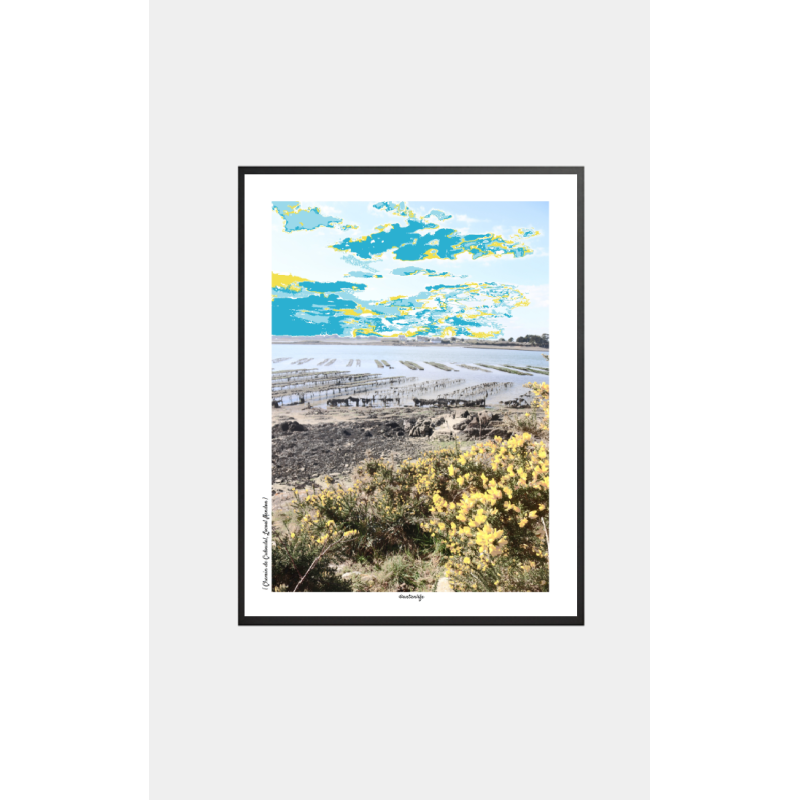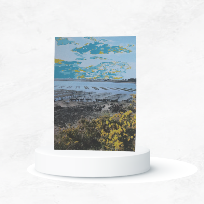 Locoal-Mendon : chemin de Cadoudal et parc à huîtres illustrés dans un style joyeux et coloré. On y sent la chaleur des beaux jours, les ajoncs dorés, et l’envie de traîner au bord de la Ria ou de l'eau tout simplement.