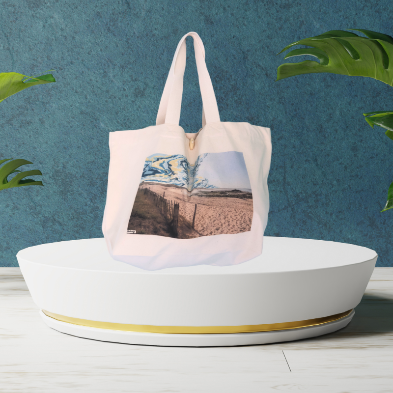 Même philosophie que la trousse, mais en version XL. Ce sac en tissu premium (350g, fabrication éthique, impression éco-responsable) reprend une photographie artistique de la plage de Kerhilio, entre sérénité et lumière douce du petit matin. À quelques kilomètres de la Ria d’Étel, ce lieu est un vrai coin de paradis pour ceux qui aiment les grandes étendues naturelles et les promenades pieds nus.