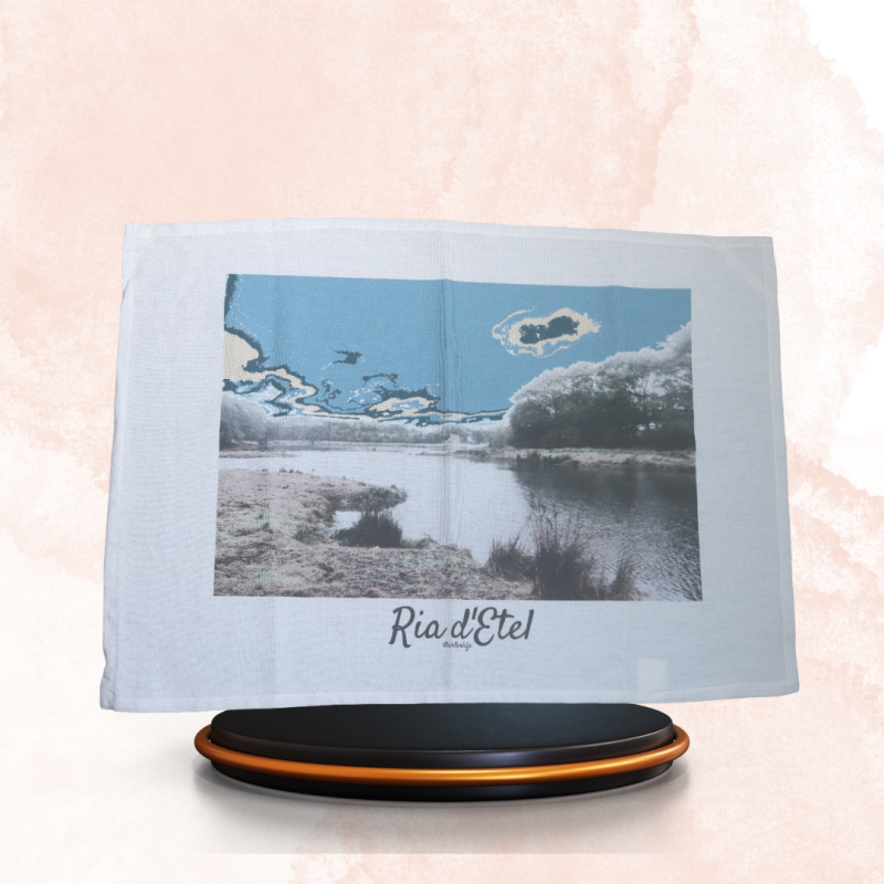 Ici, c’est l’automne en Bretagne capturé sur un torchon 100 % coton, sans métaux lourds ni mauvaise conscience. L’illustration ? Le ruisseau de Lézevry à Nostang, baigné de teintes chaudes, entre ciel beige et reflets d’un bleu profond. Une maison jaune trône en fond, comme un repère dans le paysage. C’est le cadeau utile et poétique par excellence : il essuie, il décore, et il raconte une balade automnale au bord de la Ria d’Étel.