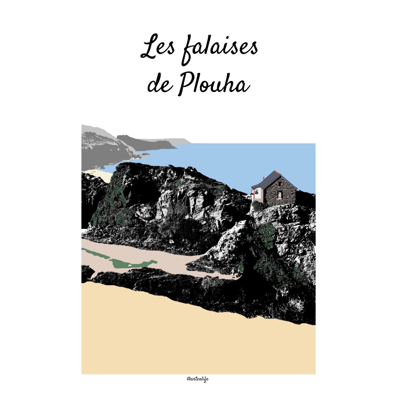 Cette affiche illustrée de la Place du Martray à Tréguier, sur la Côte des Ajoncs d’Or dans les Côtes-d’Armor, capture l’âme chaleureuse et vivante du centre historique. La scène met en valeur les maisons à colombage colorées, déclinées dans des tons de bleu, marron et jaune chocolat, dont l’une se distingue par son toit et sa façade caractéristiques.