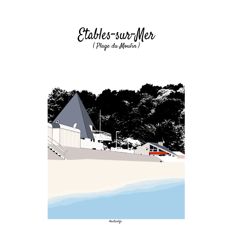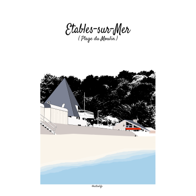 Cette affiche illustrée de la Place du Martray à Tréguier, sur la Côte des Ajoncs d’Or dans les Côtes-d’Armor, capture l’âme chaleureuse et vivante du centre historique. La scène met en valeur les maisons à colombage colorées, déclinées dans des tons de bleu, marron et jaune chocolat, dont l’une se distingue par son toit et sa façade caractéristiques.