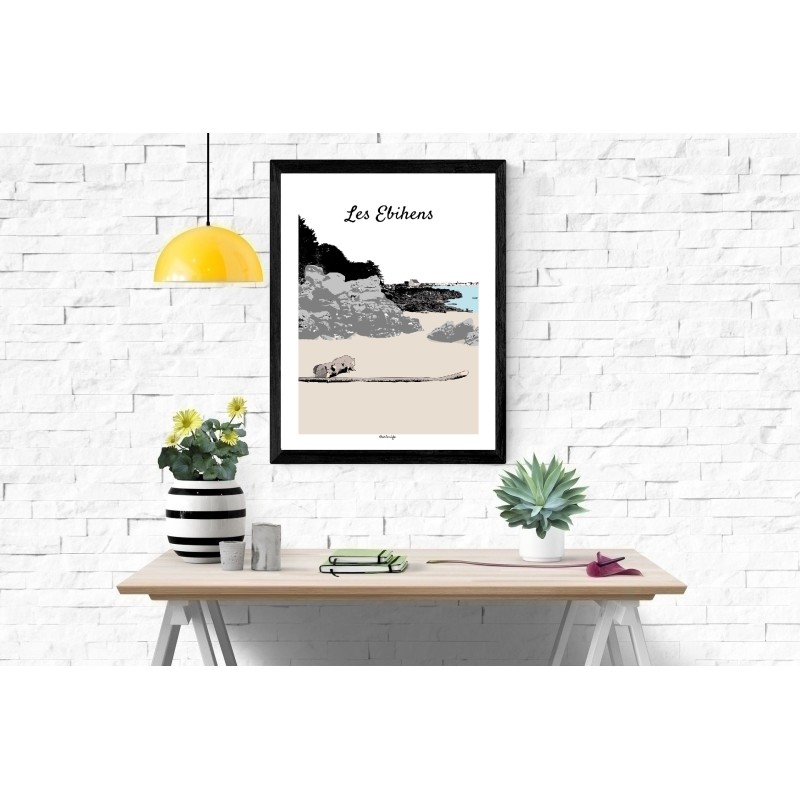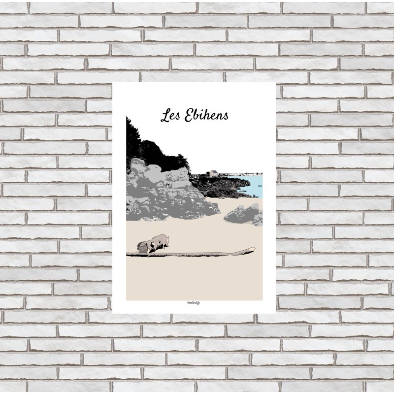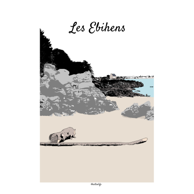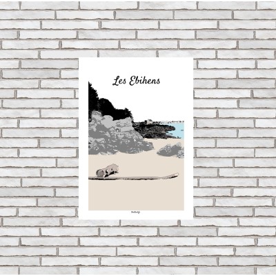 Affiche illustrée d'une des plages de l'archipel des Ebihens à Saint-Jacut de la Mer entre la Côte d'Emeraude et la Côte de Penthièvre dans les Côtes d'Armor.