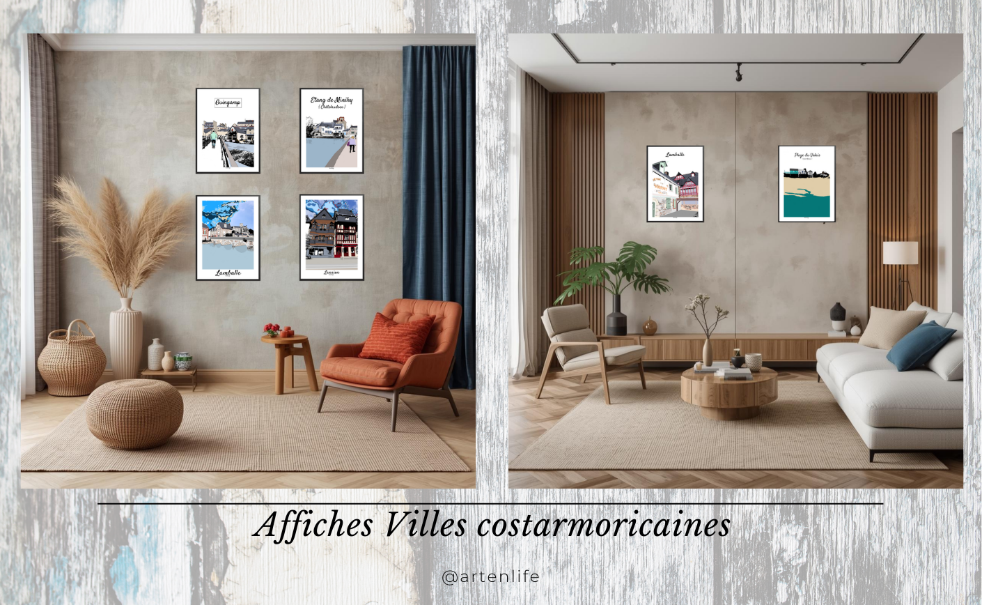 En décoration, ces affiches déco Côtes d’Armor s’intègrent parfaitement dans des intérieurs bord de mer, modernes ou chaleureux. Dans un salon lumineux, une chambre apaisante ou un espace de travail créatif, elles apportent une touche d’évasion maritime, d’élégance bretonne et de caractère, tout en invitant au voyage et à la contemplation.