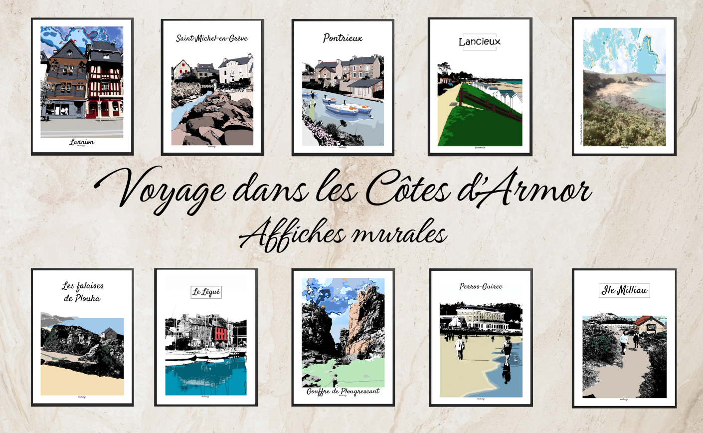 À travers une collection d’affiches illustrées et photographiques, chaque lieu devient un fragment de souvenir, une émotion capturée, une fenêtre ouverte sur la Bretagne.