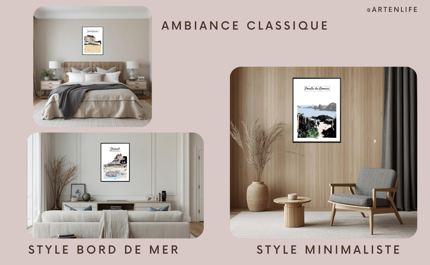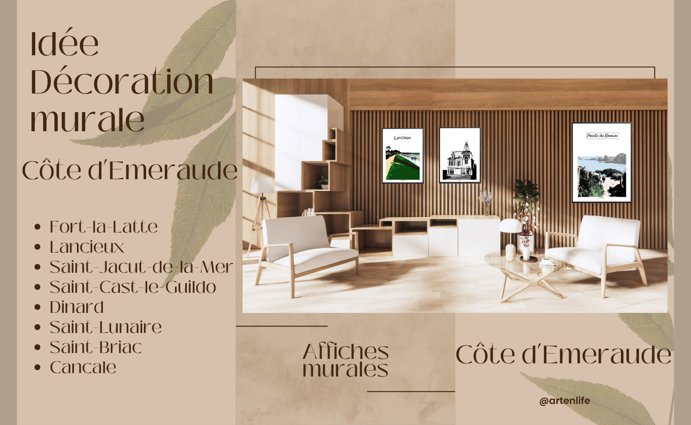 Découvrez une vidéo immersive dédiée à la Côte d’Émeraude, entre falaises, plages, villas et lumière marine. Elle met en scène nos affiches maritimes Bretagne dans des intérieurs contemporains et chaleureux.