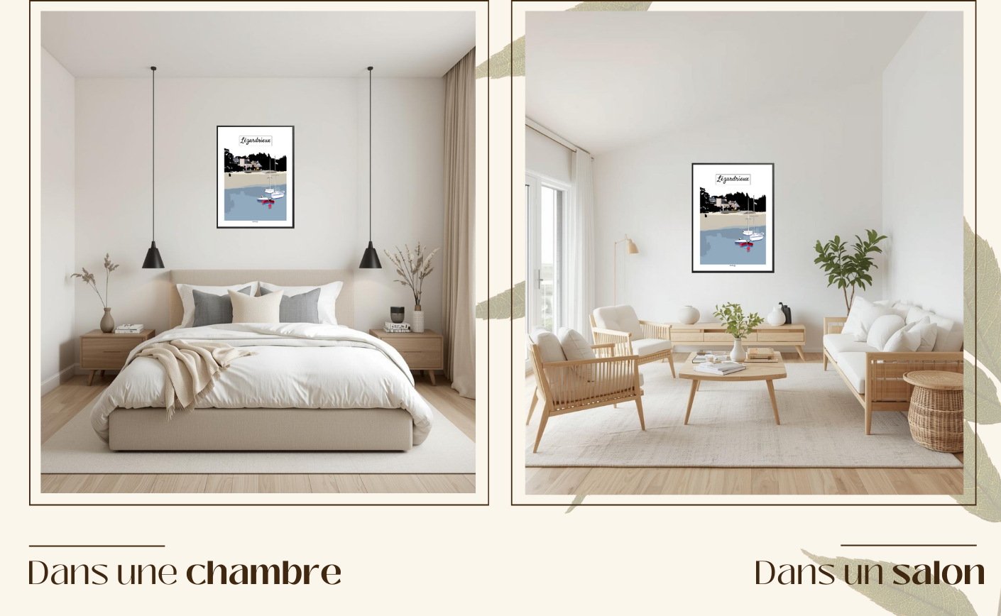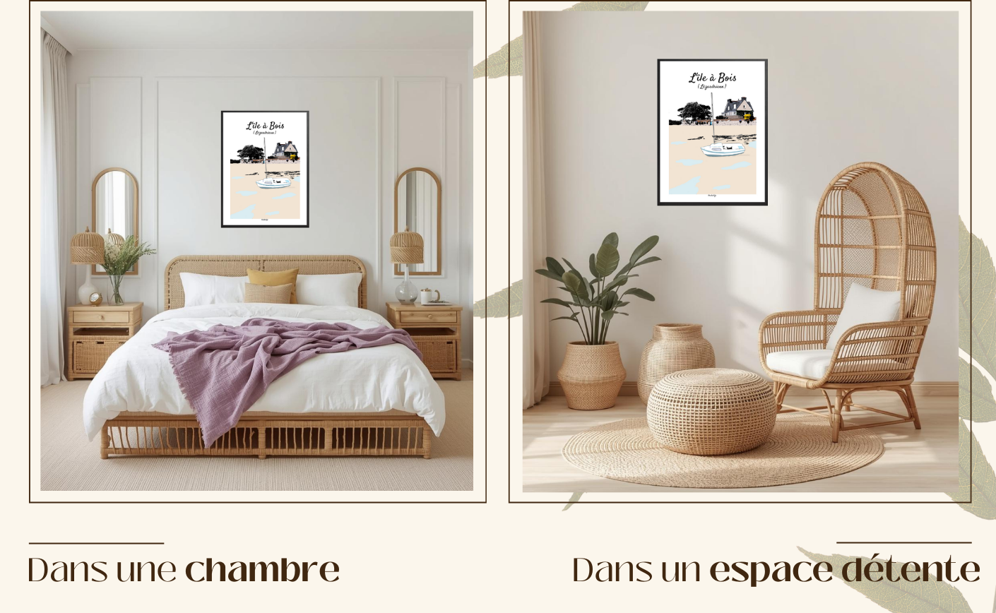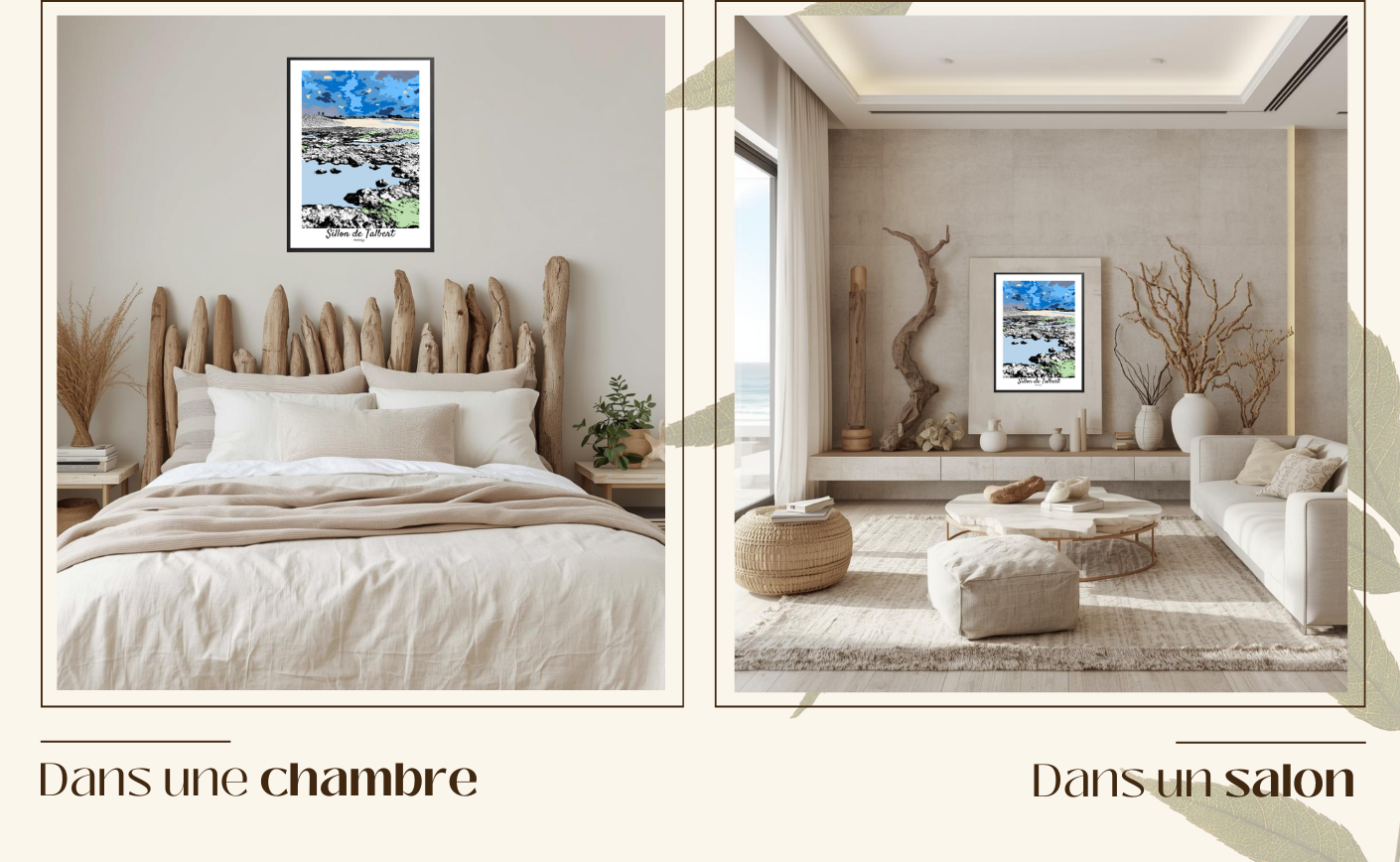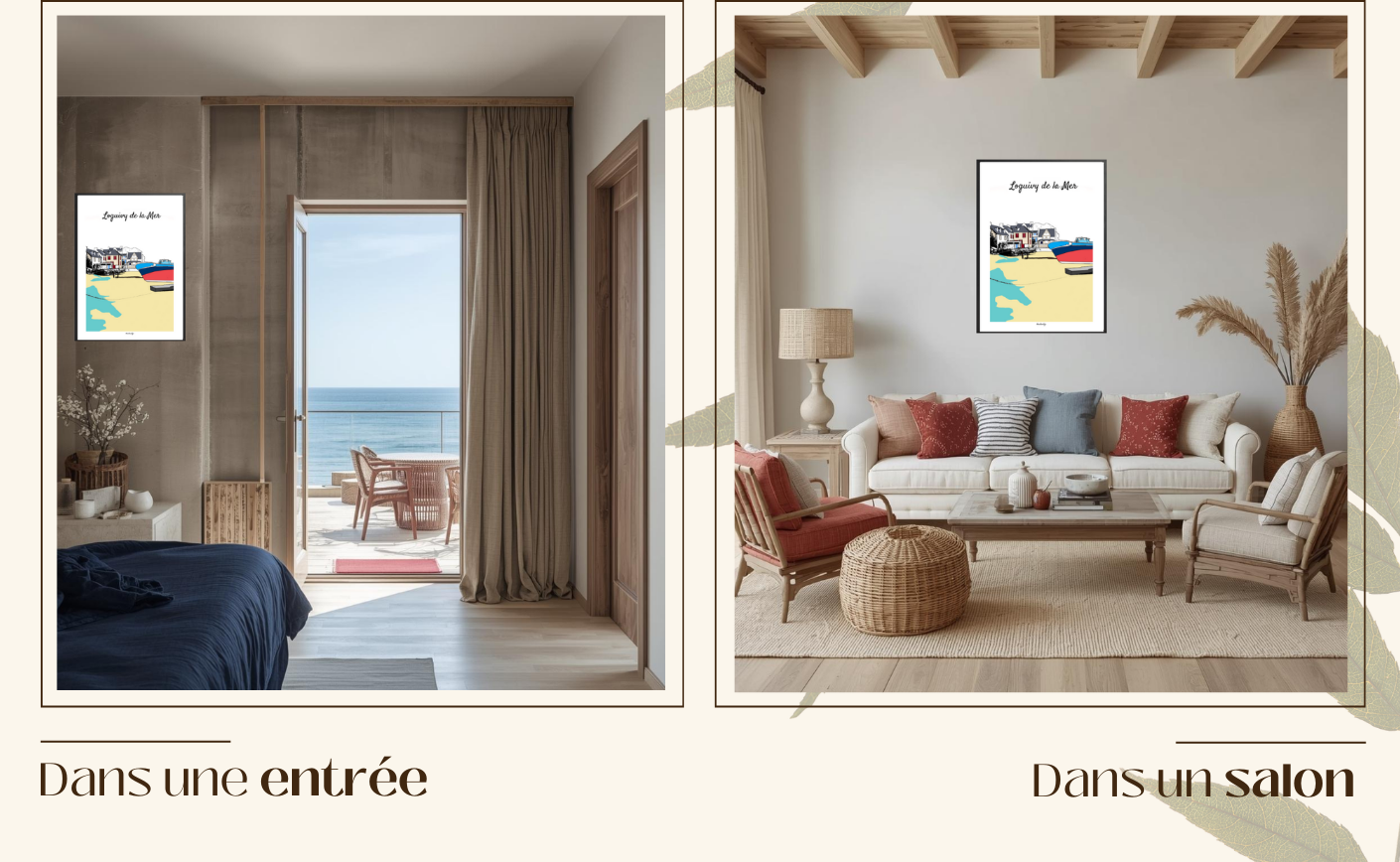 En décoration intérieure, cette affiche murale bord de mer pour salon ou chambre trouve naturellement sa place dans un espace lumineux. Associée à du bois flotté, du lin et des textiles sable, elle renforce l’harmonie naturelle de la pièce. Dans un espace détente ou une maison de vacances, ce poster déco des Côtes d’Armor apporte apaisement et douceur. Cette illustration bretonne contemporaine devient un véritable support de sérénité visuelle.