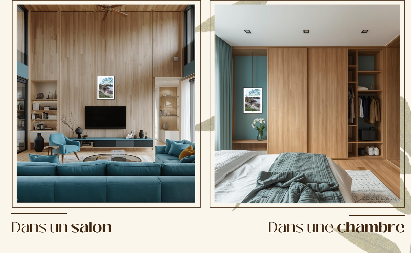 Dans un salon contemporain, elle sublime les intérieurs avec des touches de turquoise et bois clair. Dans une chambre, elle procure apaisement et évasion, faisant entrer la nature bretonne dans votre décor.