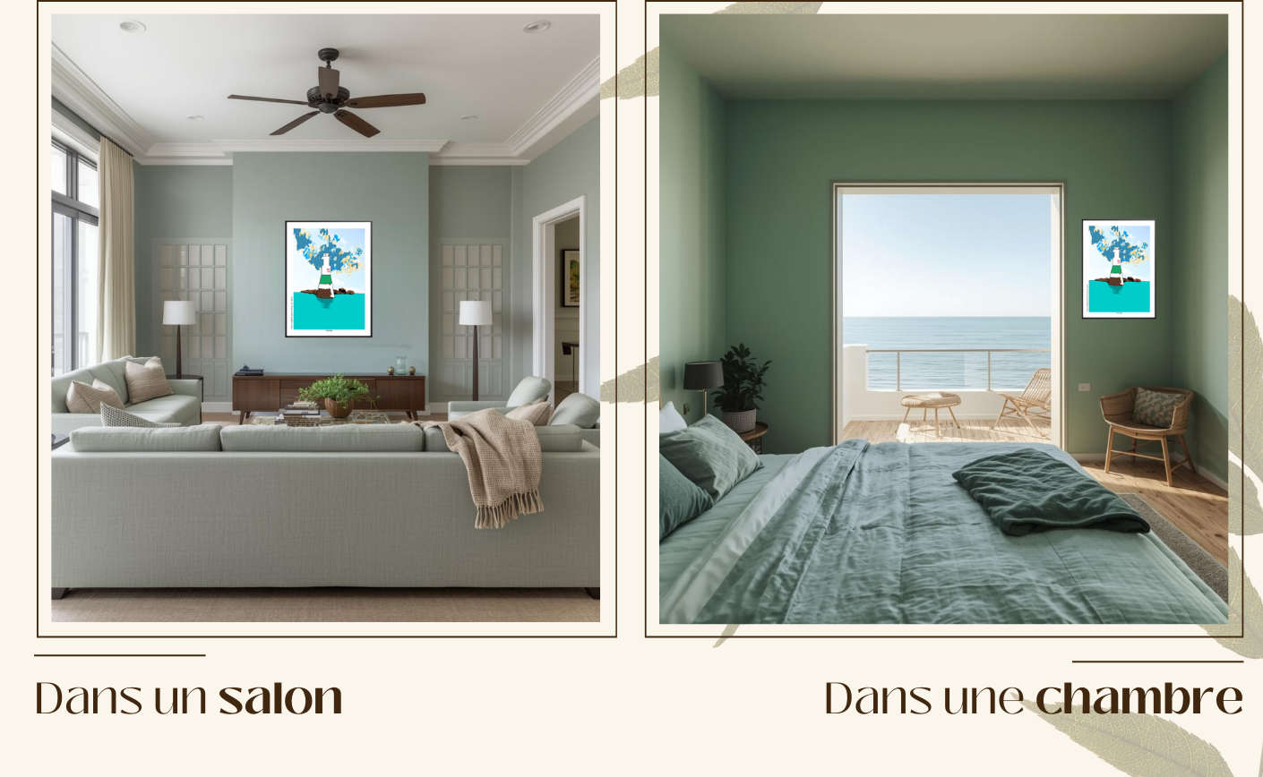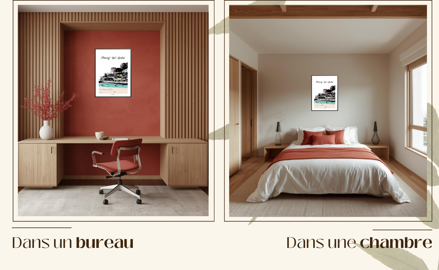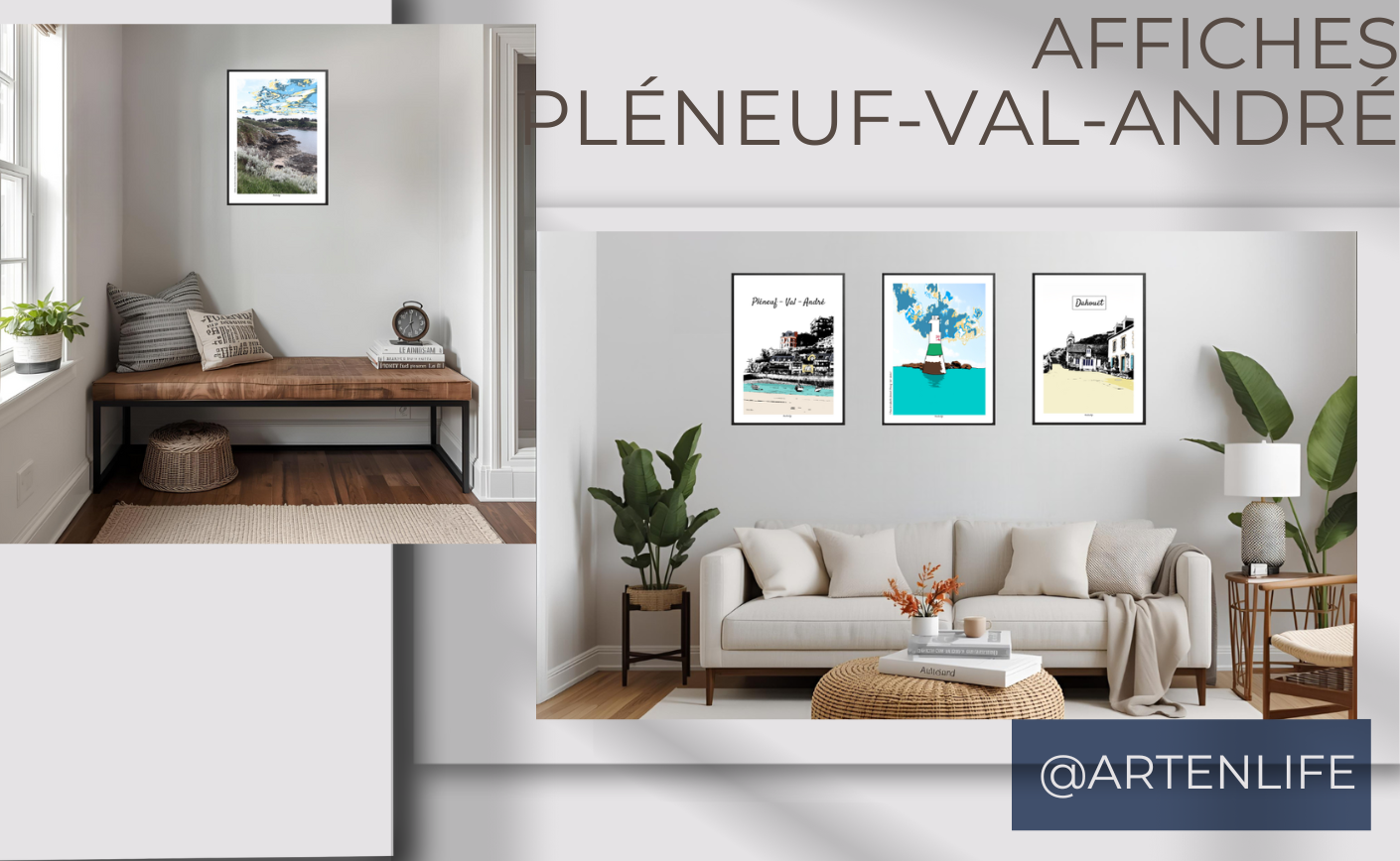 Les affiches de Pléneuf-Val-André offrent plus qu’une décoration : elles racontent des histoires, capturent l’esprit du littoral breton et apportent lumière et sérénité dans vos intérieurs. Adaptées aux styles bord de mer, minimaliste ou contemporain, elles s’associent facilement à des matériaux naturels comme le bois clair, le lin ou le blanc cassé, pour un effet à la fois chaleureux et élégant.