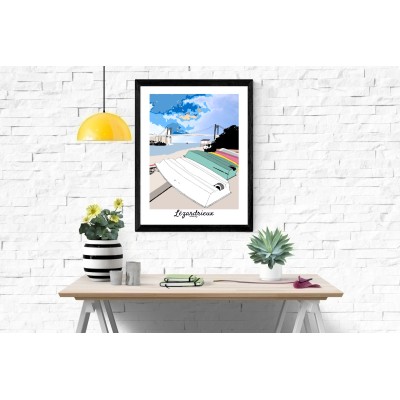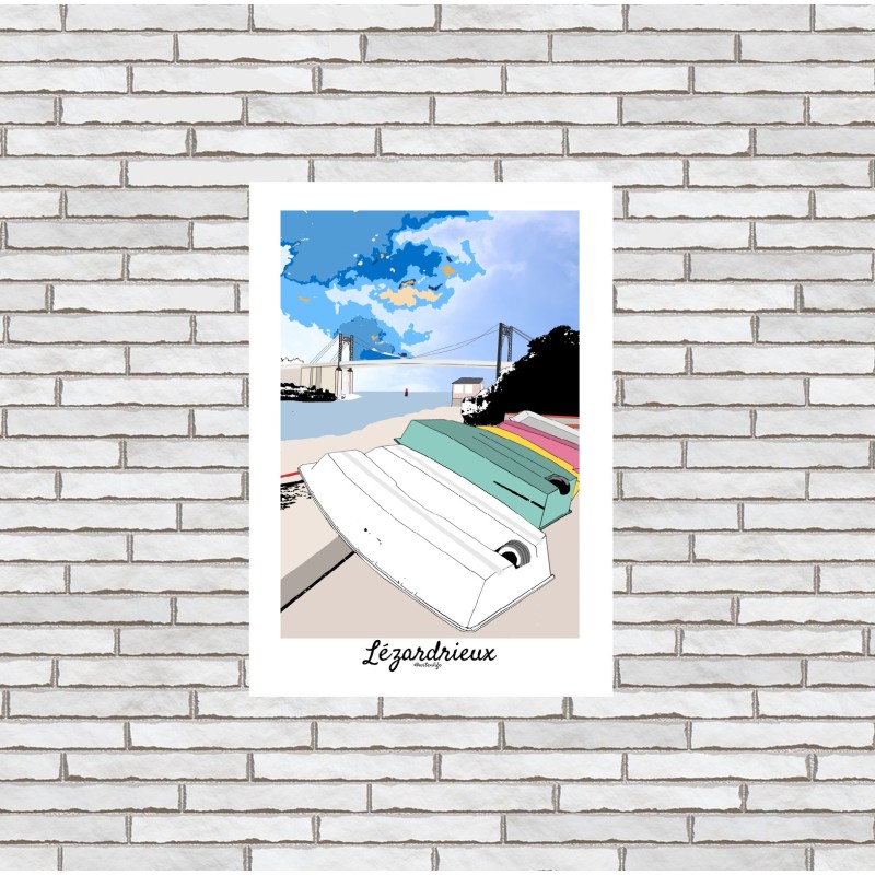 Cette affiche illustrée de Lézardrieux, dans les Côtes-d’Armor en Bretagne, met à l’honneur le pont métallique emblématique de la commune, véritable trait d’union entre les rives et les époques. Dominant la rivière du Trieux, sa structure en fer se détache avec élégance sur le paysage, offrant un point de vue privilégié sur les eaux calmes en contrebas.