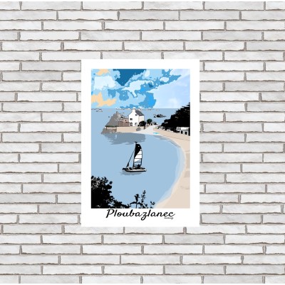 À l’horizon, la mer bleue, les îlots rocheux et l’embouchure du Trieux prolongent la perspective, renforçant la sensation d’ouverture et de liberté. Réalisée dans un style graphique coloré façon bande dessinée et pixelisé dans le ciel, cette affiche décorative bretonne mêle douceur narrative, dynamisme visuel et attachement au littoral.