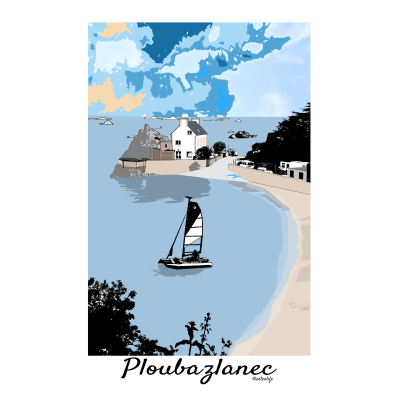 Cette affiche illustrée de la plage de Roc’h Hir à Ploubazlanec, dans les Côtes-d’Armor en Bretagne, invite à une promenade visuelle le long du chemin côtier, là où la terre rencontre doucement la mer. Au premier plan, les feuillages sombres encadrent naturellement la scène, offrant un contraste élégant avec la luminosité du paysage.