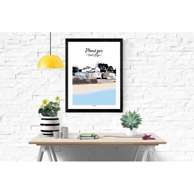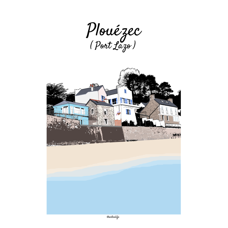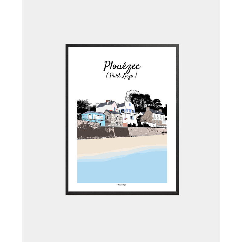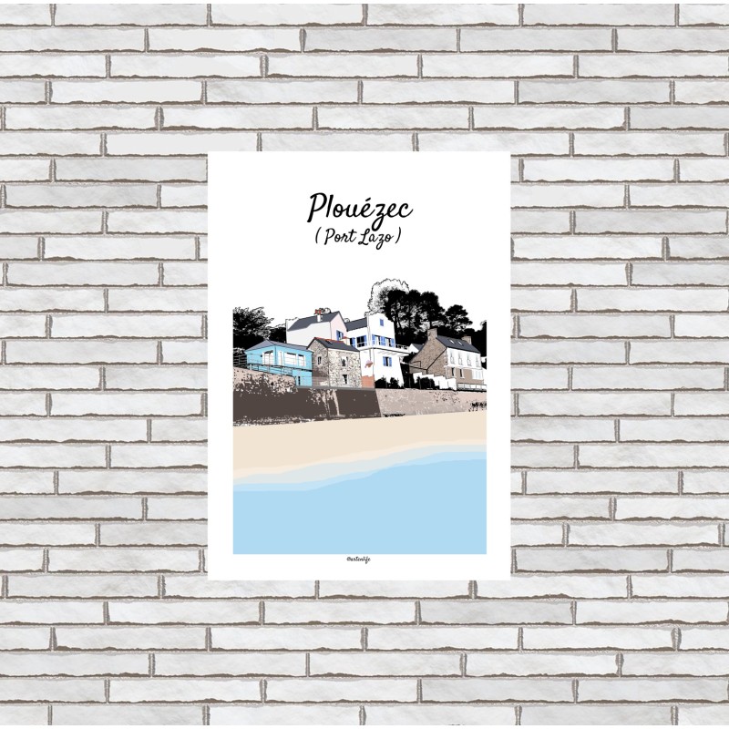 Cette affiche illustrée du village de Port-Lazo à Plouézec, dans les Côtes-d’Armor en Bretagne, met en lumière l’équilibre harmonieux entre patrimoine breton et modernité architecturale, au cœur d’un paysage maritime lumineux. Vue depuis la plage, la scène dévoile toute la richesse visuelle de ce petit port de caractère.