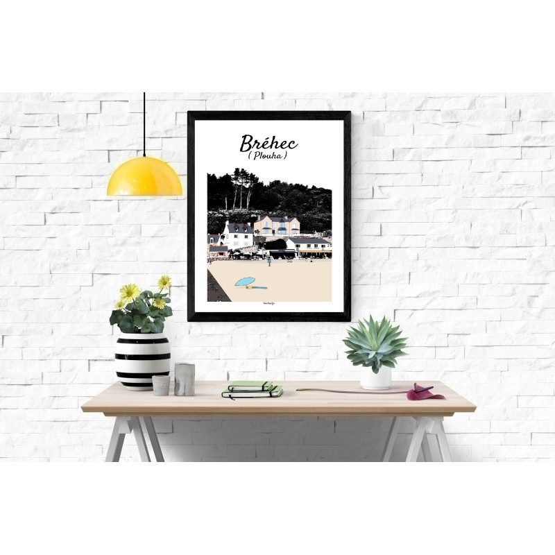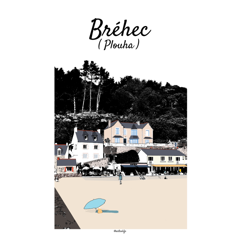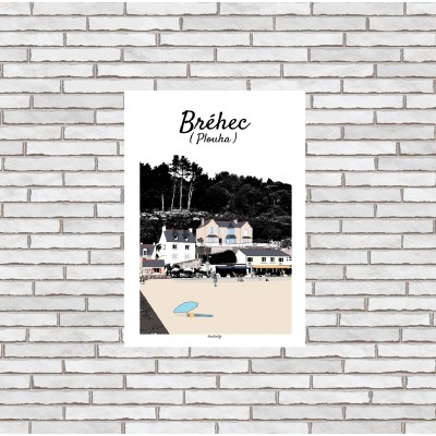 Cette affiche illustrée de la plage de Bréhec à Plouha, dans les Côtes-d’Armor en Bretagne, capture la vie et la douceur d’un littoral vivant et coloré. Le paysage met en scène les bâtisses traditionnelles bretonnes, alignées le long du bord de mer, avec leurs toits et façades aux teintes beiges, rosées et jaunes, contrastant avec la végétation sombre en arrière-plan.