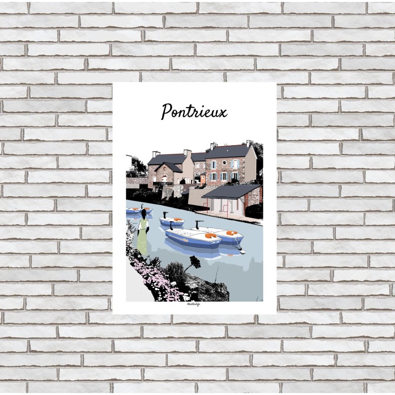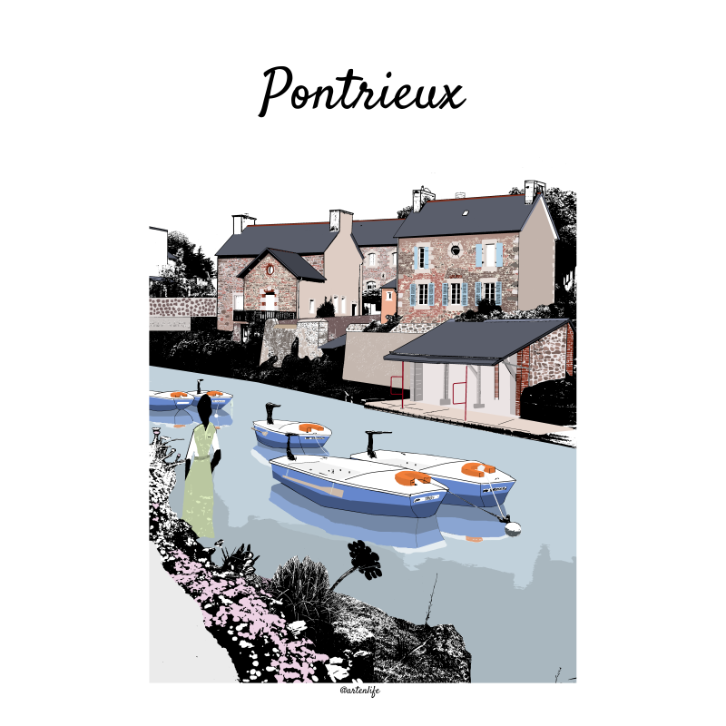 Cette affiche illustrée du Trieux et des lavoirs de Pontrieux, dans les Côtes-d’Armor en Bretagne, met en scène l’un des paysages les plus emblématiques de cette cité de caractère. Bordant la rivière, les lavoirs traditionnels racontent la mémoire du quotidien d’autrefois, entre gestes simples et vie collective.