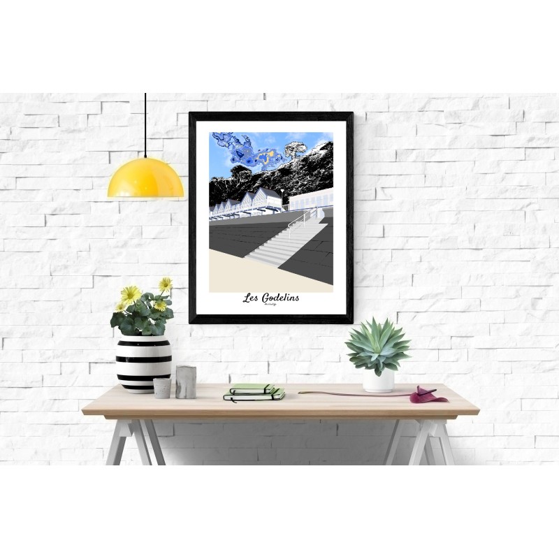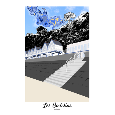 Cette affiche illustrée de la plage des Godelins à Étables-sur-Mer, dans les Côtes-d’Armor en Bretagne, capture l’esprit joyeux et intemporel des stations balnéaires. Alignées le long de la digue grise, les cabines de plage aux rayures bleu et blanc évoquent immédiatement les vacances, les bains de mer et les après-midis ensoleillés.