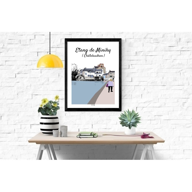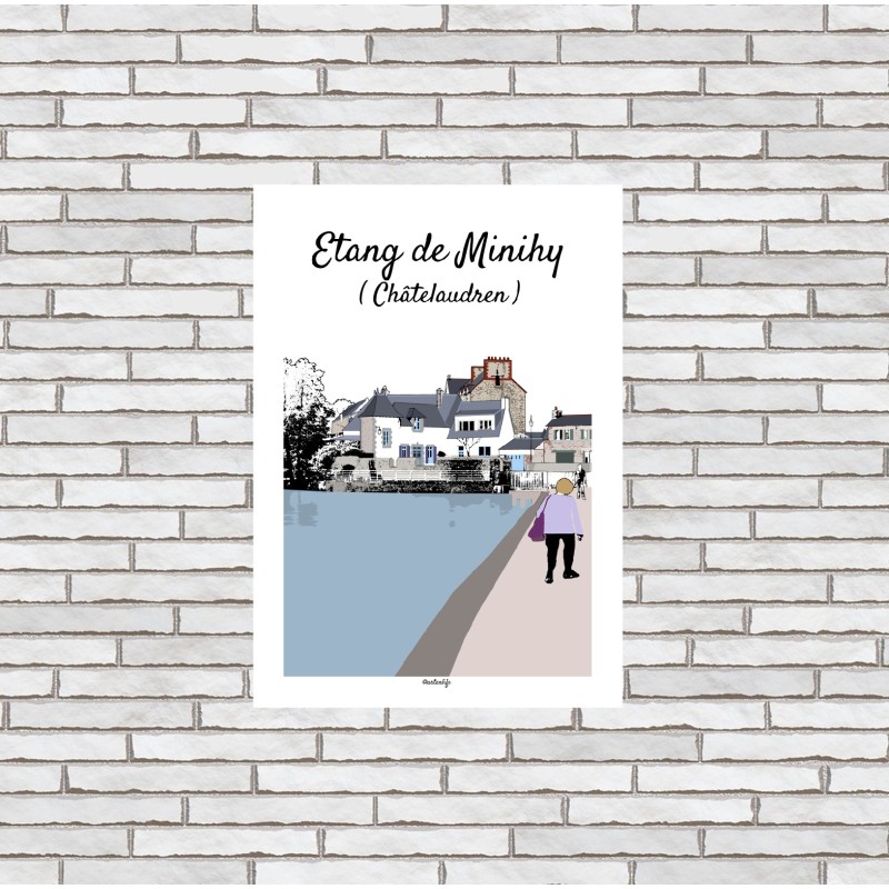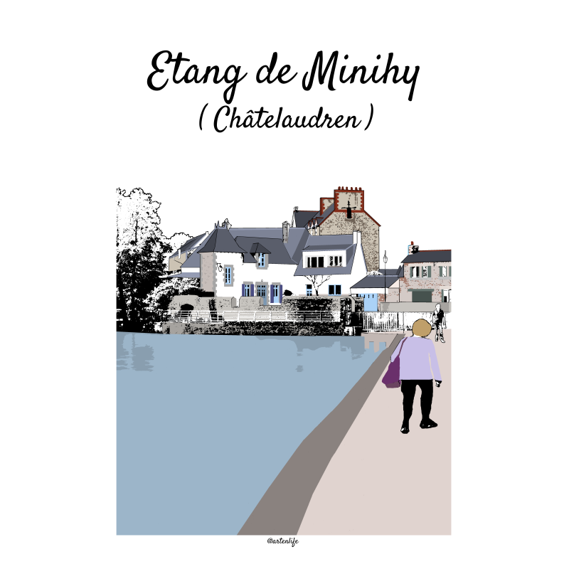 Cette affiche illustrée de l’étang de Minihy à Châtelaudren, dans les Côtes-d’Armor en Bretagne, offre un panorama paisible et vivant. Au premier plan, le chemin bordant l’étang invite à la promenade, où l’on croise une personne habillée en violet, apportant une touche de couleur et de mouvement à la scène.