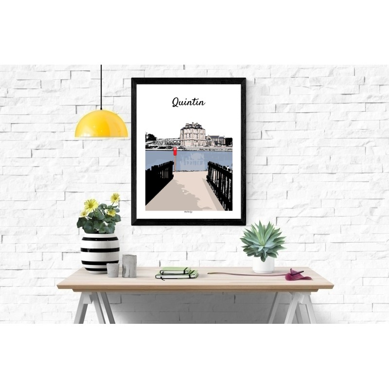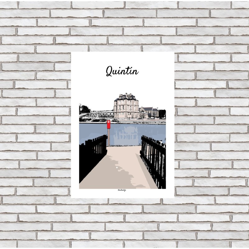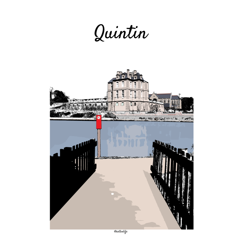 Cette affiche illustrée de l’étang de Quintin, dans les Côtes-d’Armor en Bretagne, capture la sérénité et le charme architectural de la ville. La scène offre une vue depuis l’une des passerelles bordant l’étang bleu, où les reflets dans l’eau accentuent la profondeur et la douceur du paysage.